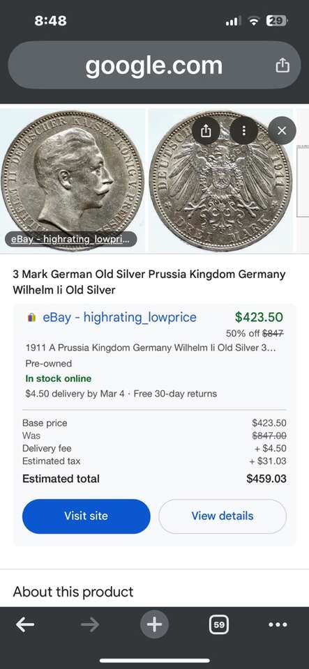 PayPalThis beauty is a silver 1911 A deutsches reich it is in really good condition. The last two pictures are to show you what one went for Please fill free to do any research on this and let me know what you questions please text