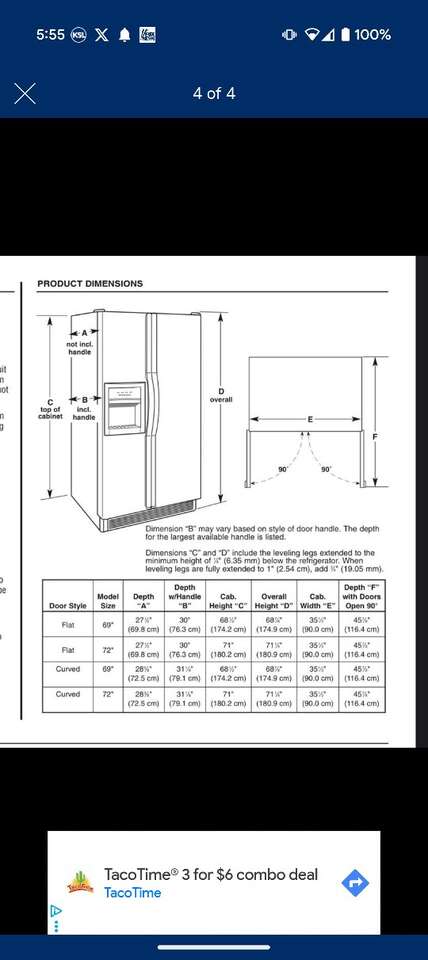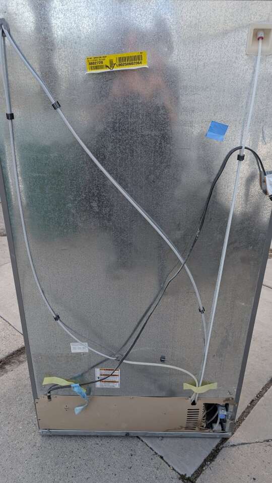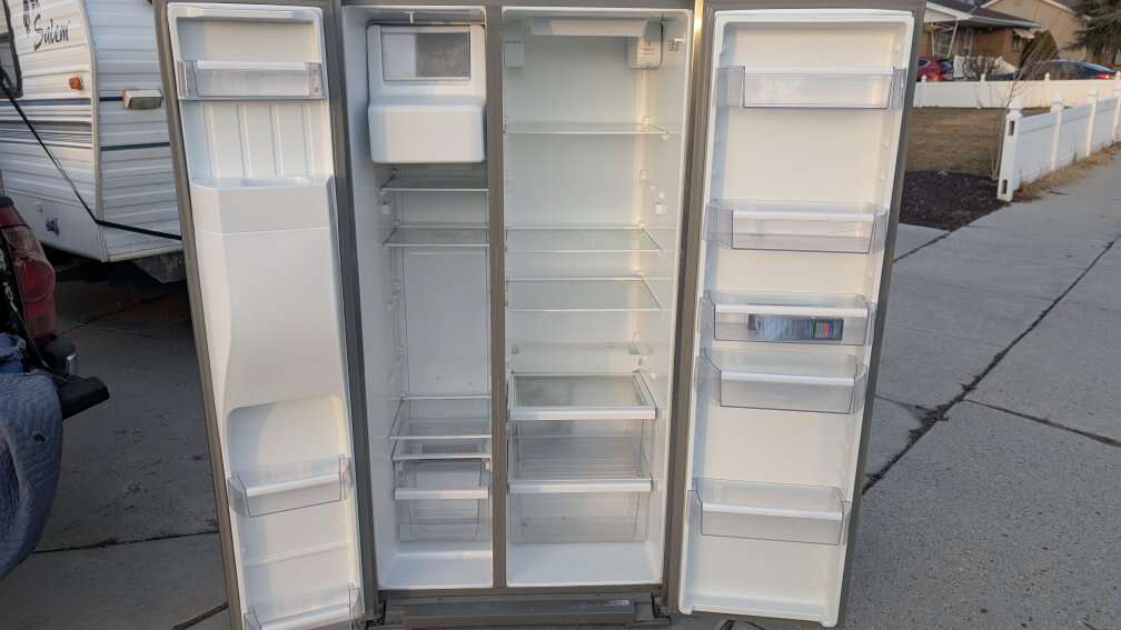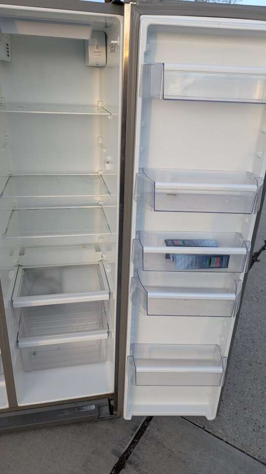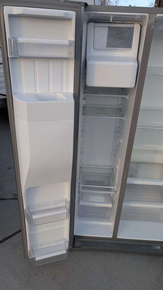 Some damaged shelves and drawer (see pics) but otherwise in good shape. Tested and cools great, but ice maker may not work. Water dispenser tested and works See photos and attached drawing/schem for dimensions 69" flat