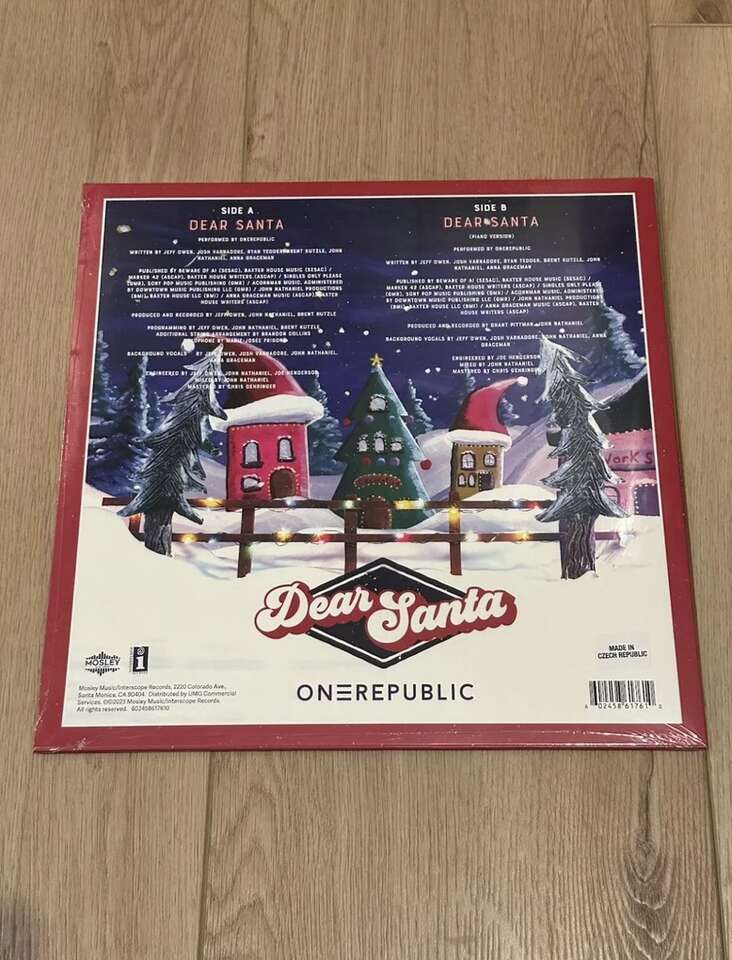 Limited 12 pressing of OneRepublic's holiday single Dear Santa, pressed on Red Translucent Vinyl. As you can see from the pictures, it is brand new and sealed but it has a little bit of wear from the album on the top. It isn’t horrible but it is there for sure. I got a few that came damaged and I’m selling them so I numbered them but only put pictures of #1 on here because they are all in really similar condition, so if you want one I will just bring them all and you can pick which one you want. I took pictures of the worn spot and all the corners so you could see the condition. And like I said they are all pretty similar. They all just have a little wear on the top of the outer sleeve. Other than that, they are all still brand new and sealed.