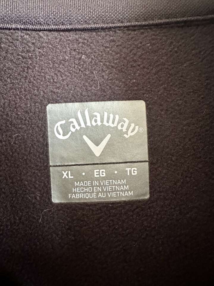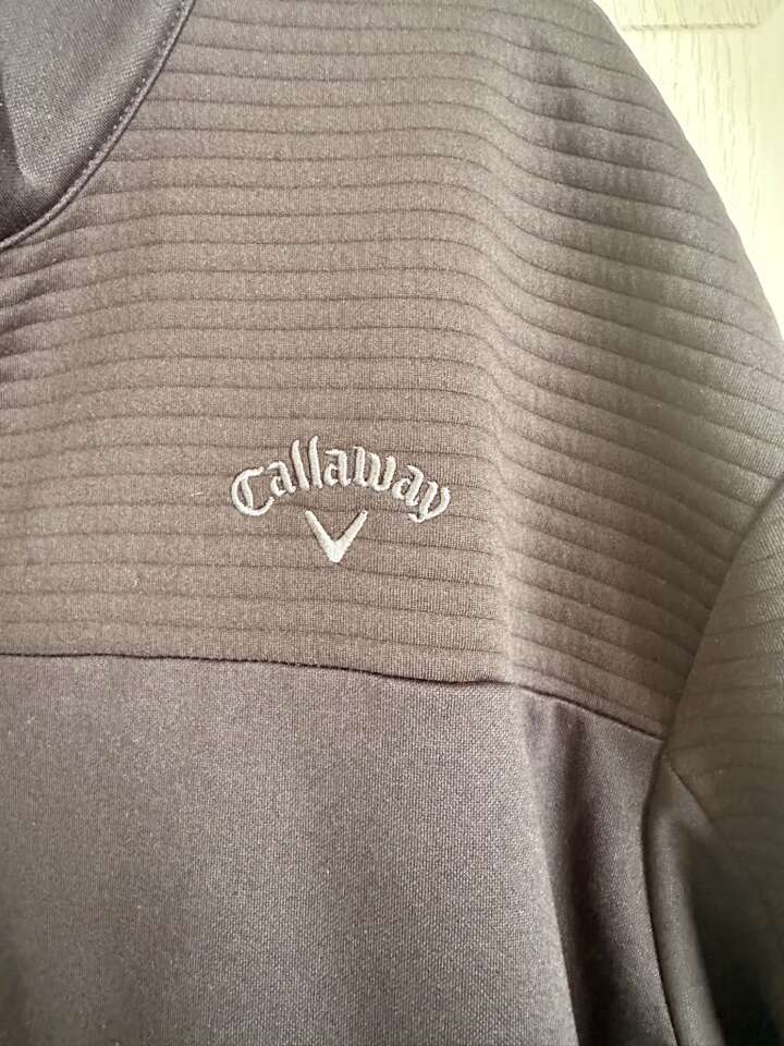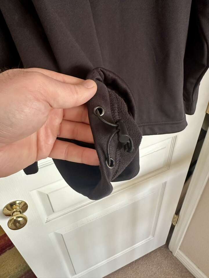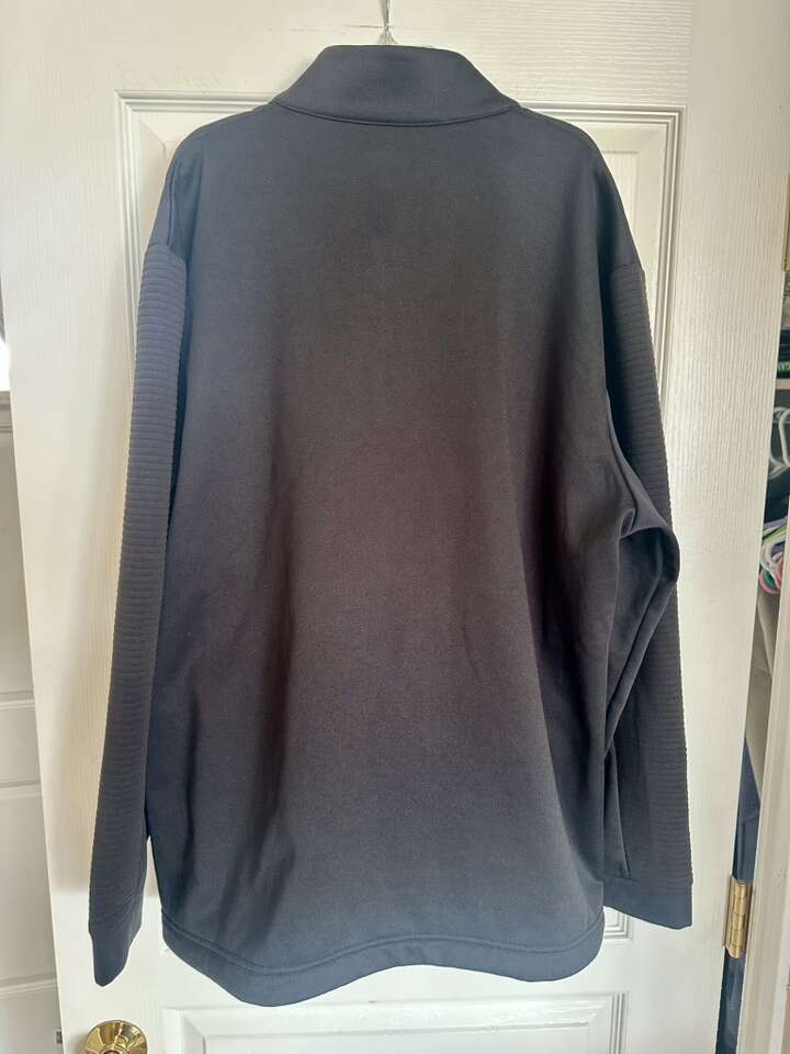 Partially ribbed and partially smooth design. It has hand pockets. 1/4 zip front. It has an adjustable cord at the bottom. $30.