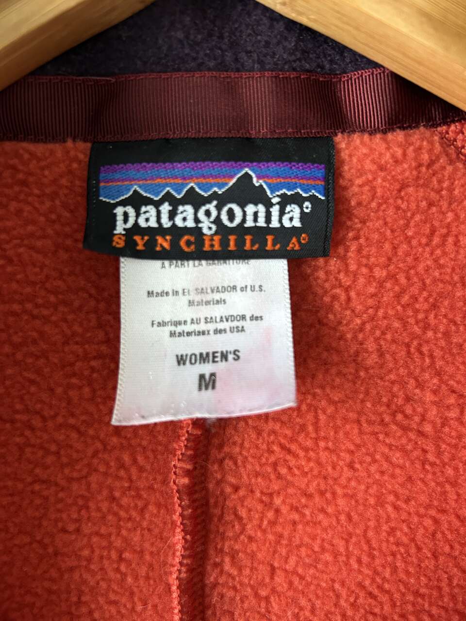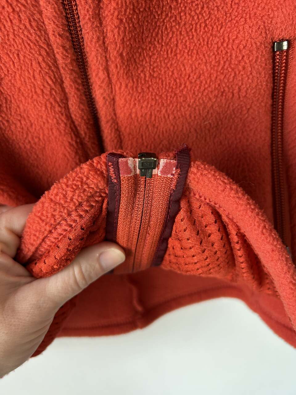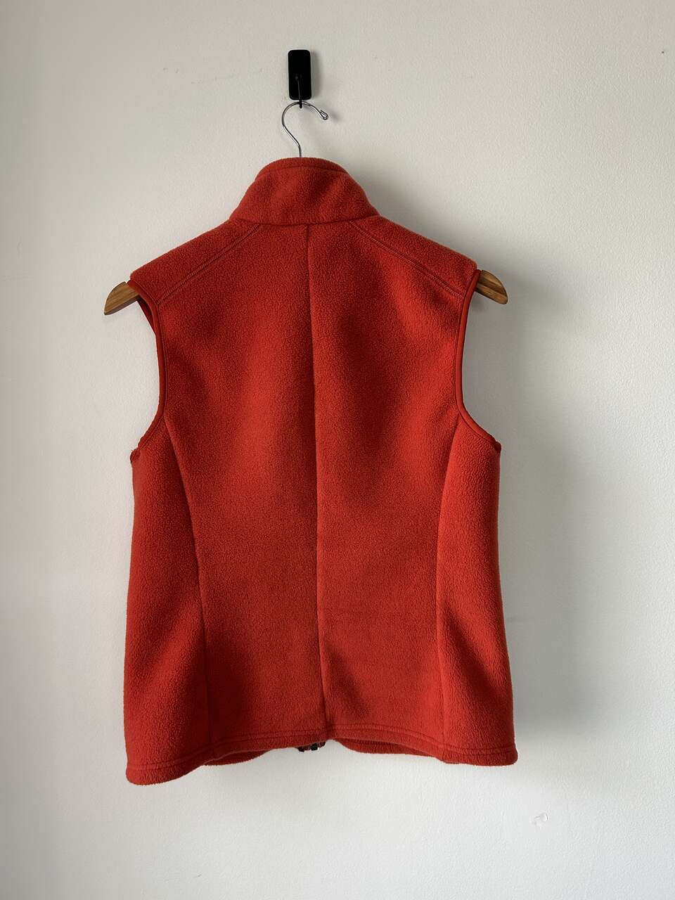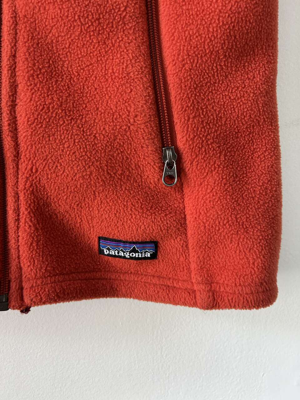 VenmoPatagonia Women’s Synchilla Fleece Vest, size medium, in red orange. I bought this a long time ago but can’t remember when. It’s still in good condition, except for a small piece of fabric unravelling at the bottom of the zipper and very small white paint spots on the bottom right side of the vest (see pictures). Both issues can be easily fixed, I just haven’t had time. This is a cozy vest, great for the outdoors, and has 2 pockets with mesh lining.
