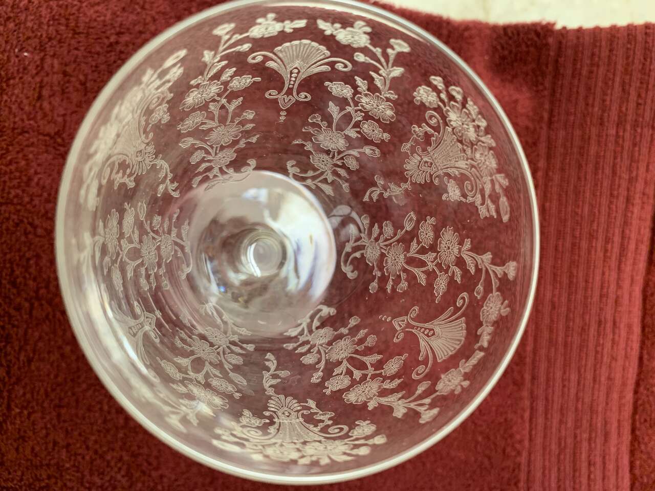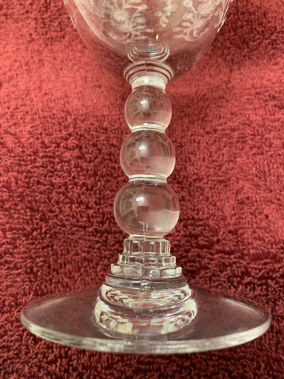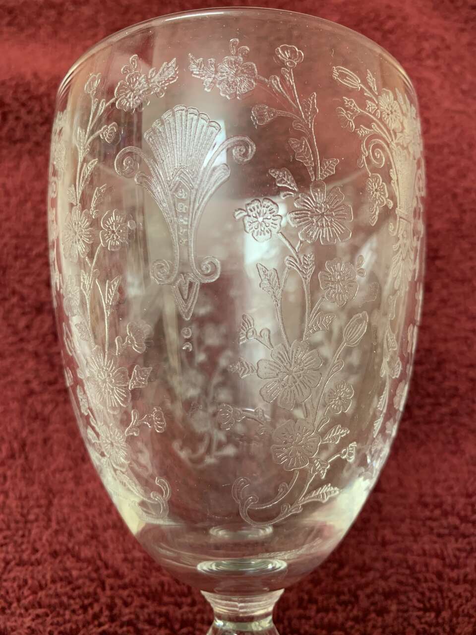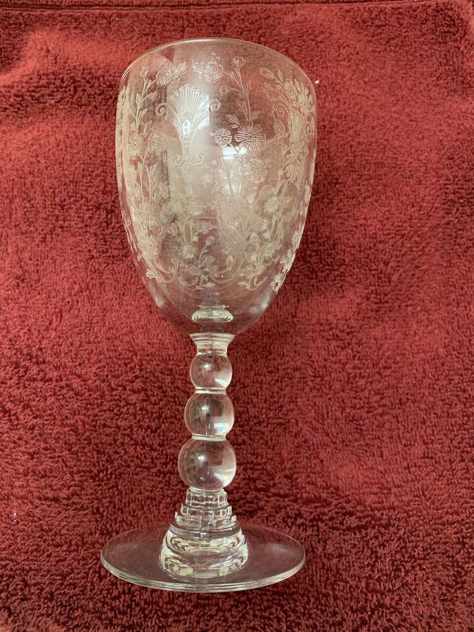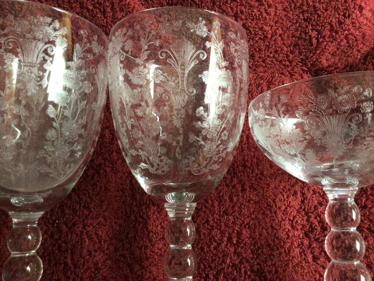 This listing is for 3 water goblets (6 7/8") plus matching sherbet/champagne (5"), etched, ball/beaded stem, clear, excellent. Beautiful ornate floral design By Duncan Miller, pattern is First Love.