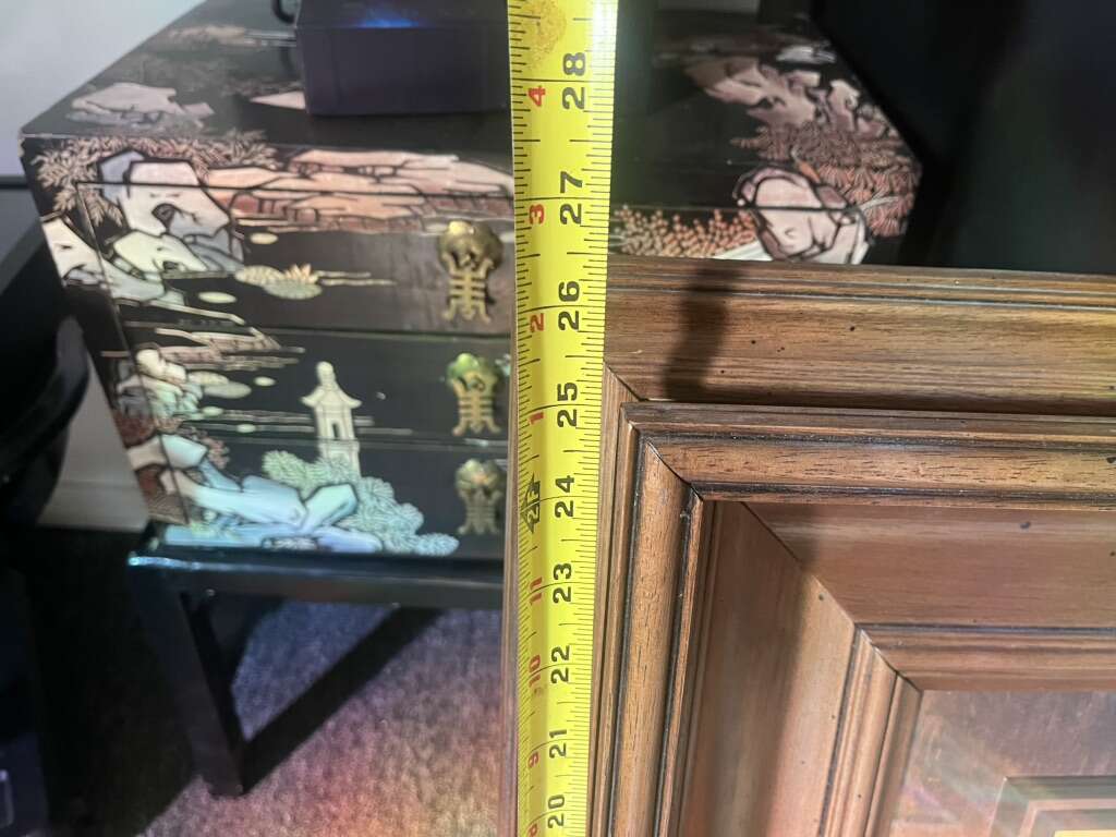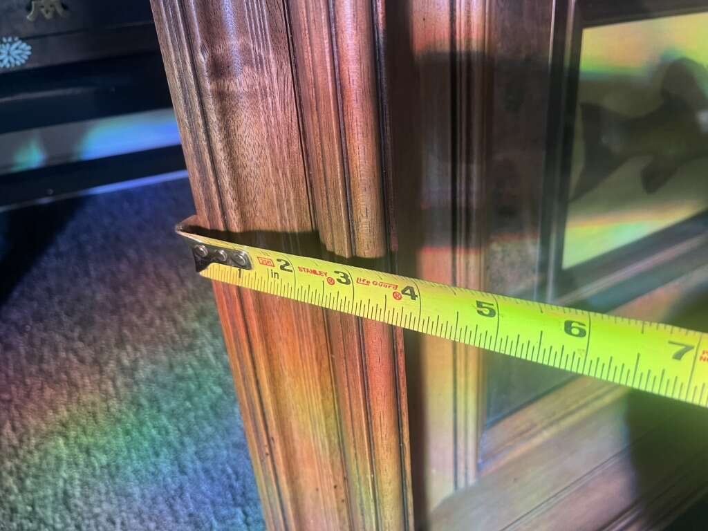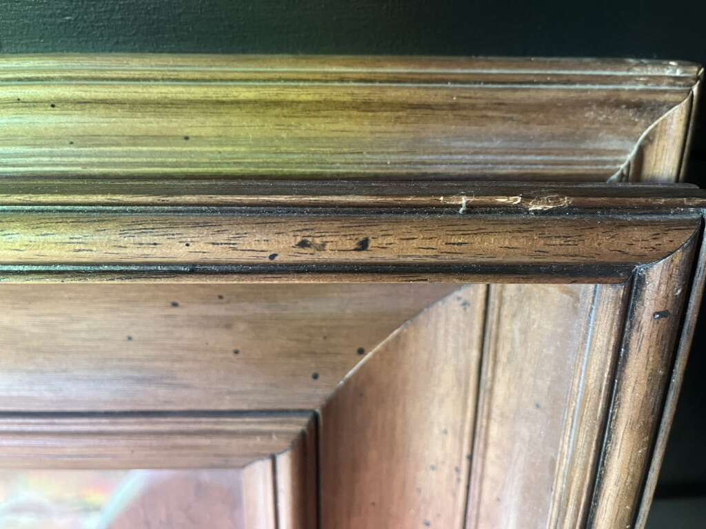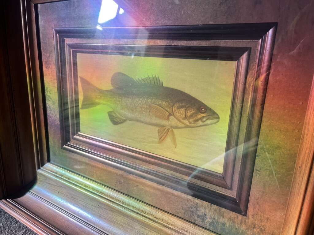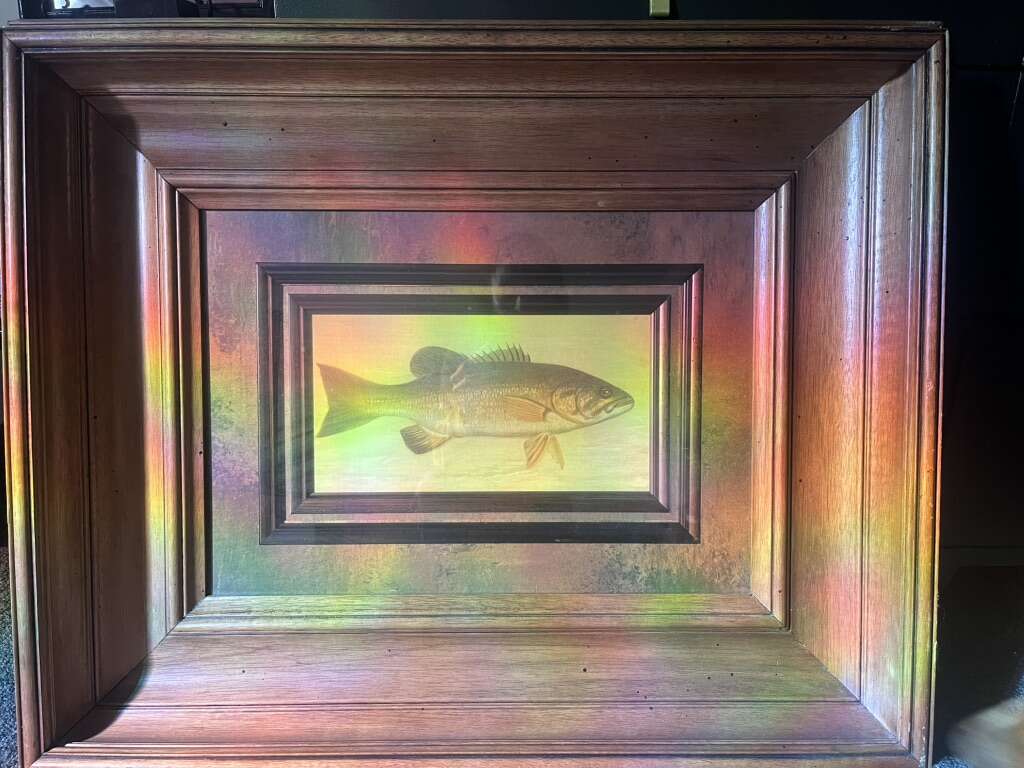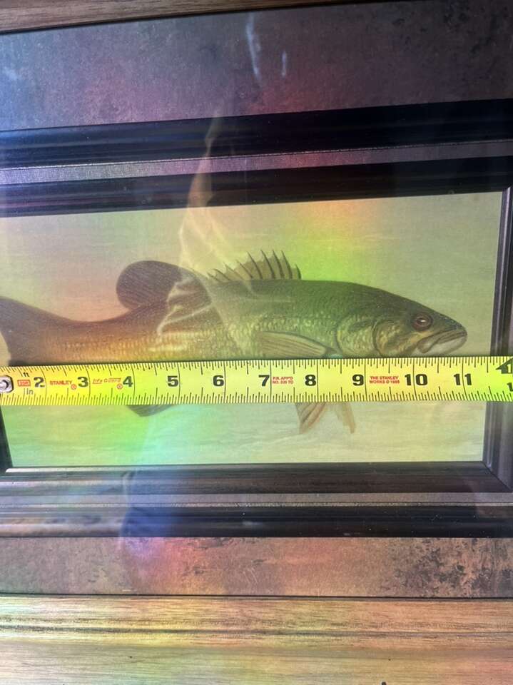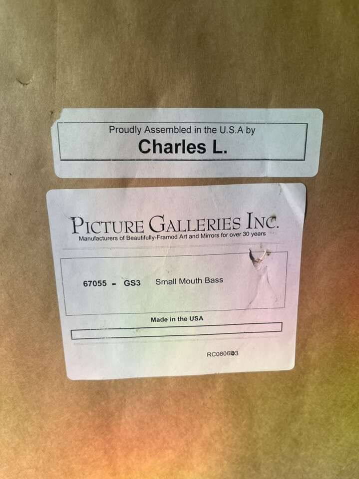 The quality of this frame is unmatched on design! Deep chestnut color, curved inside panels, matte color and outside molding! This is a nice bass fish matted and placed in a very thick wooden frame. Info on back see picture. This is perfect for office, home, cabin, man space. Firm on price