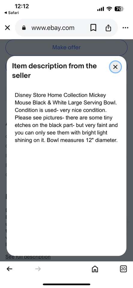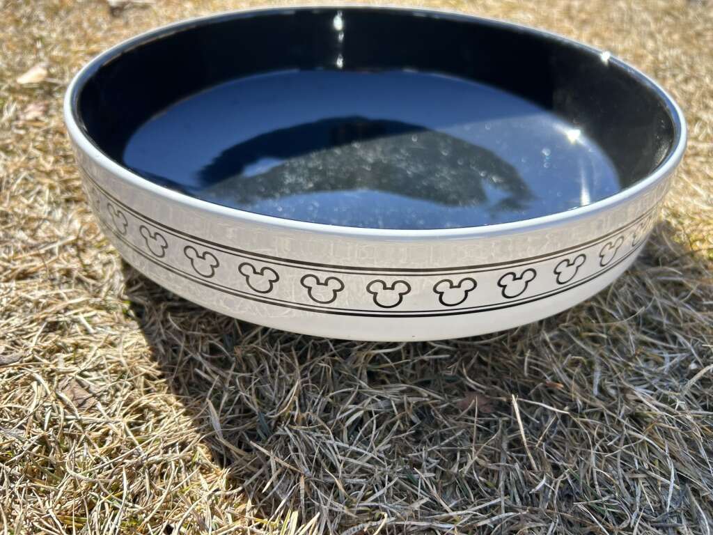 VenmoIn excellent condition from the Disney Store black and white Mickey Mouse large white serving bowl measures 12” inches in diameter. Clean. No flaws no chips no stains. Minor marks on inner bowl that probably disappear. Non smoking home.