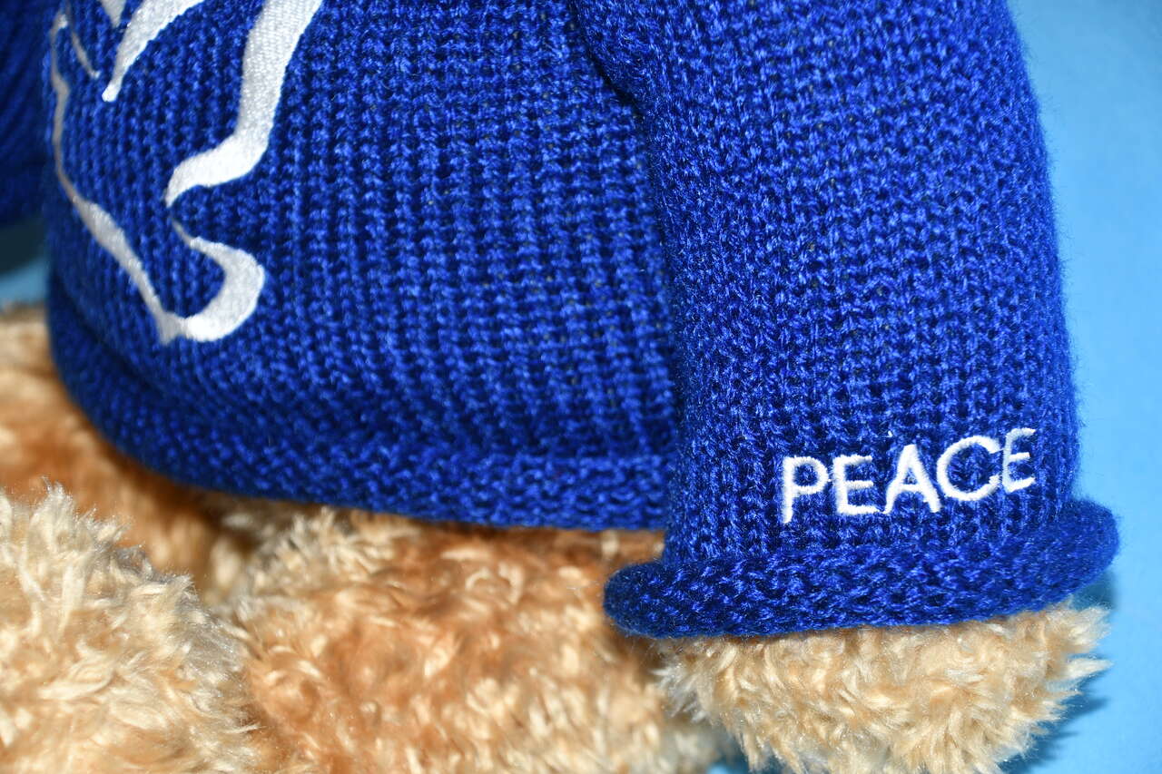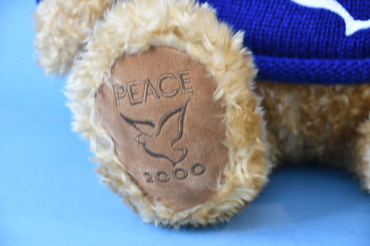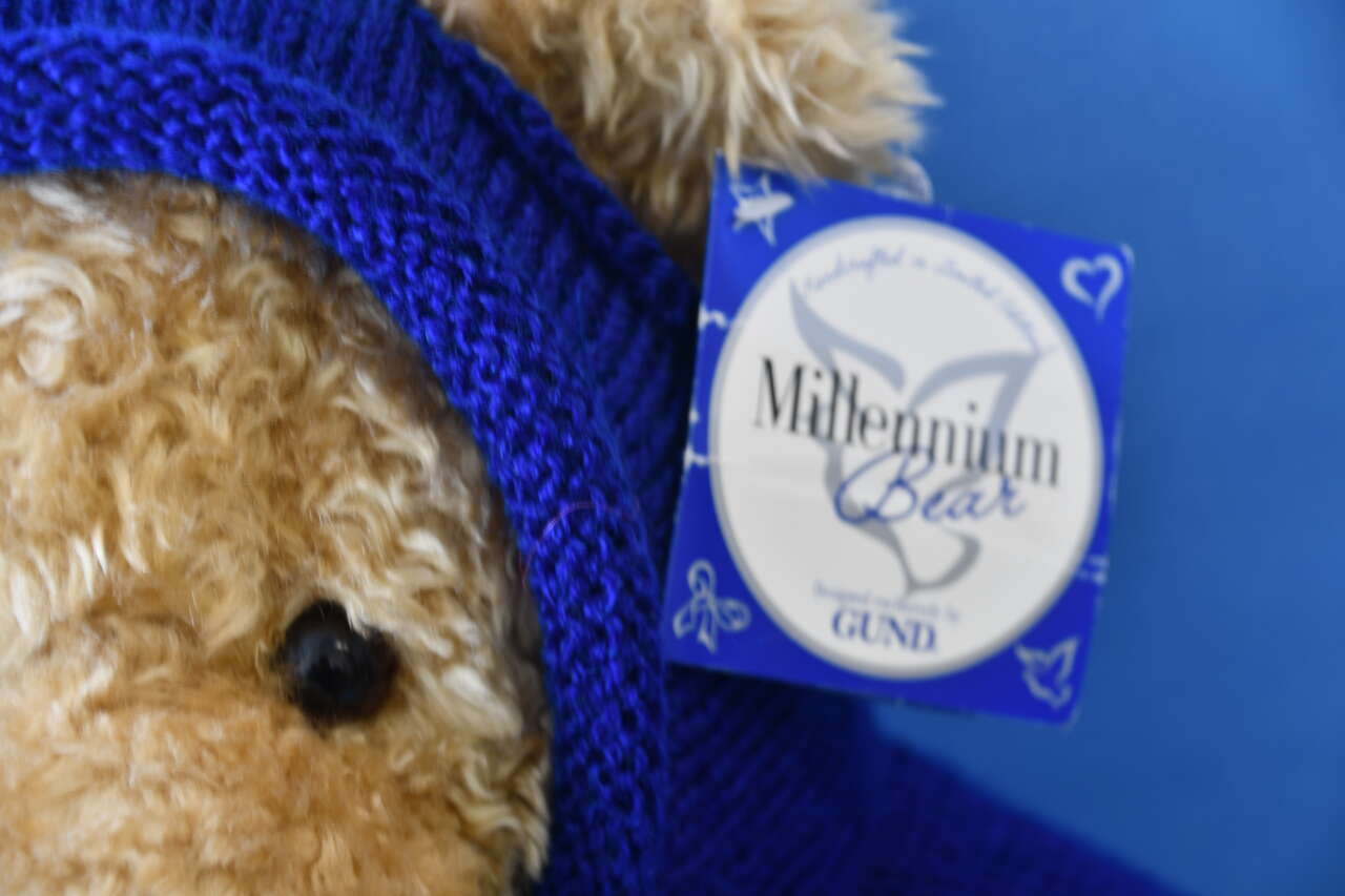 This VINTAGE 2000 GUND MILLENNIUM TEDDY BEAR with SWEATER is about 26" tall. It is CLEAN! Questions??? Please ask. We are located in Plain City. Cash only please.