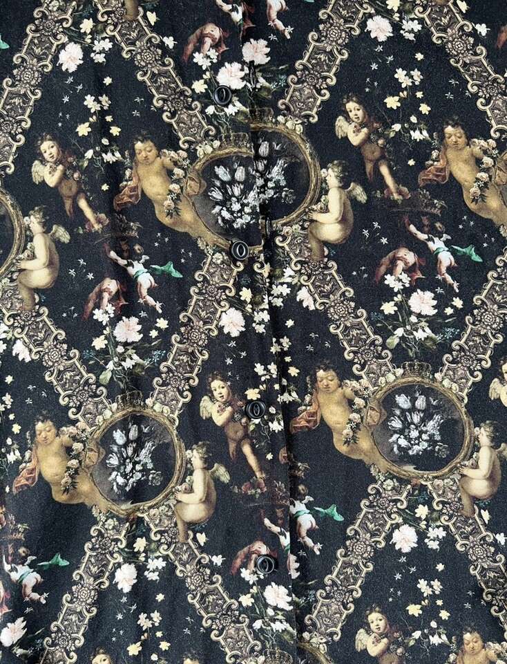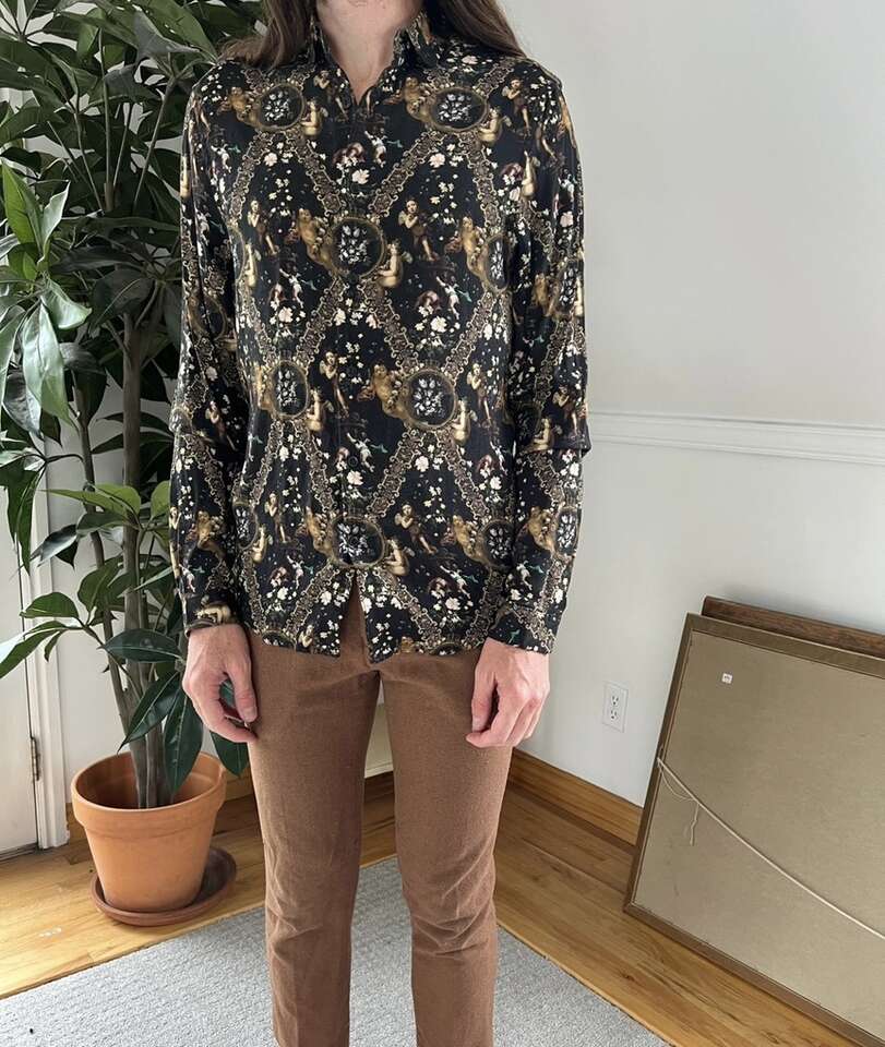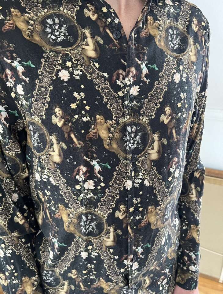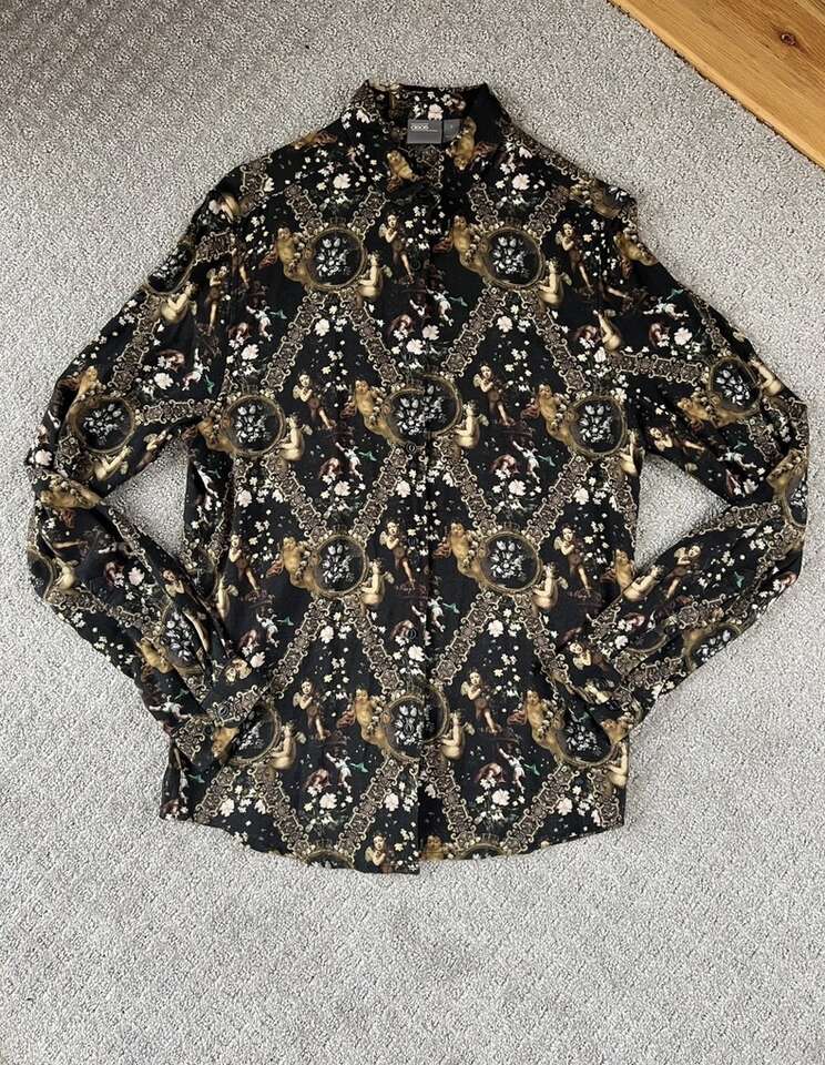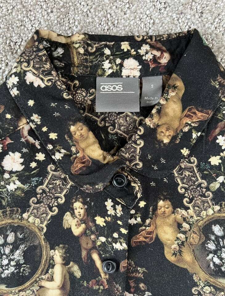 VenmoMen’s ASOS Cherub Button Up Shirt Size Small My husband only wore this a couple times. Such a cool shirt, but he prefers baggier clothes now. Cash or Venmo. Will hold with Venmo payment.