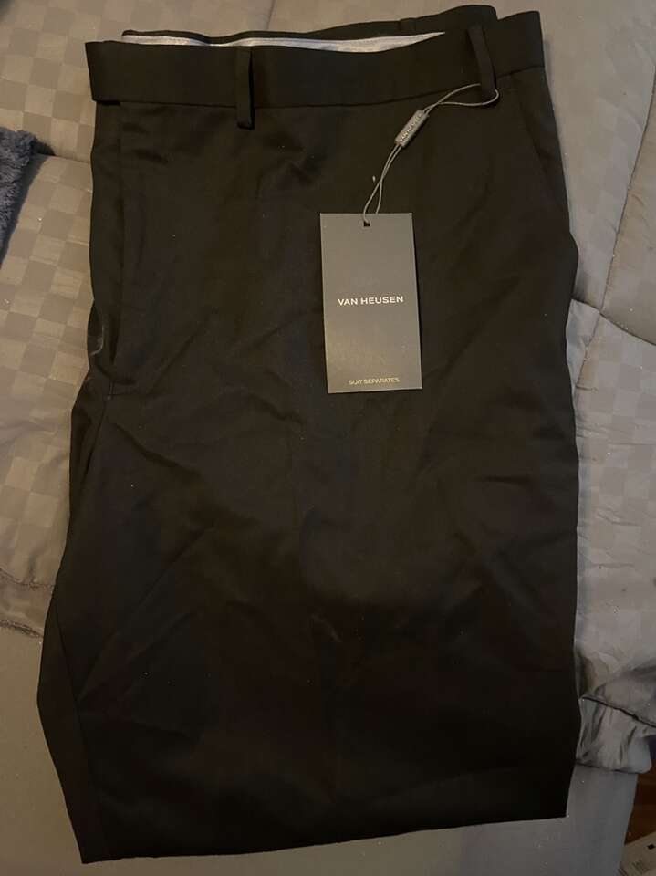 Van Heusen Black 46x32 Pants New With Tags bought but they labeled wrong the these are clearly a 46 maybe a 44 not the 48 they’re labeled as they’re too tight to button up on me.