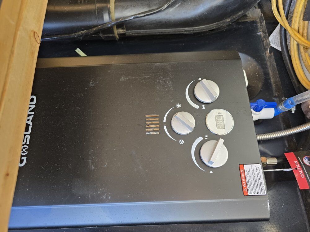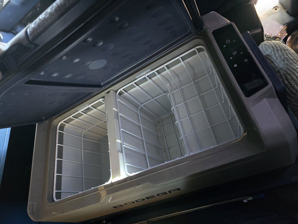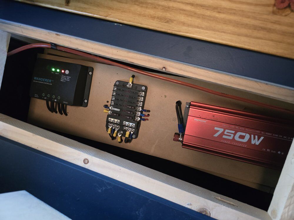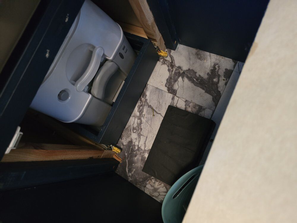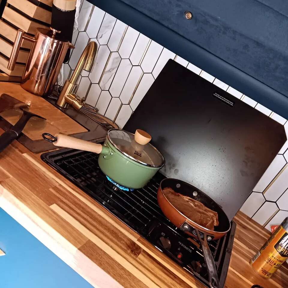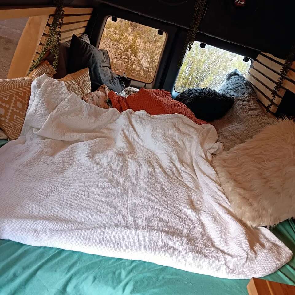 Fridge Freezer Propane stove Sink Toilet Gray Tank Fresh water tank Water pump shower water heater dining table/bench that converts to make bed even larger back up camera side mirror cameras when you use your turn signal the rear view mirror Will show you your blindspots diesel heater batteries soloar panels