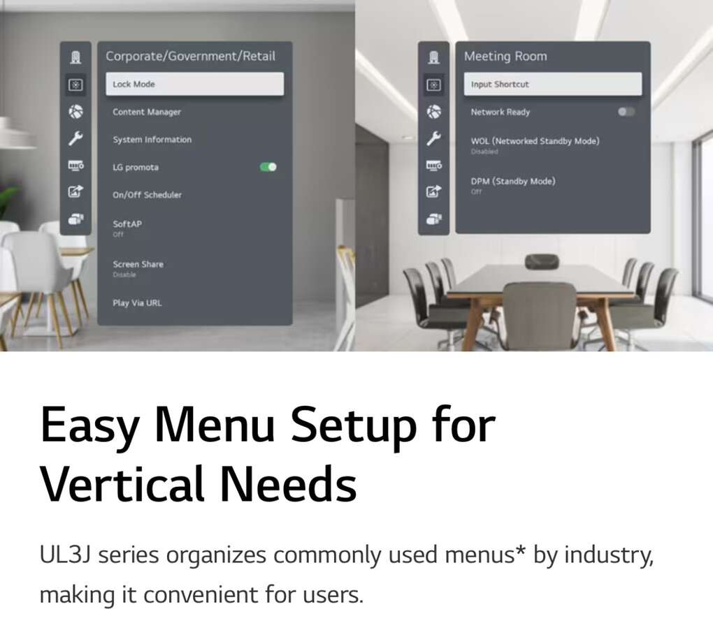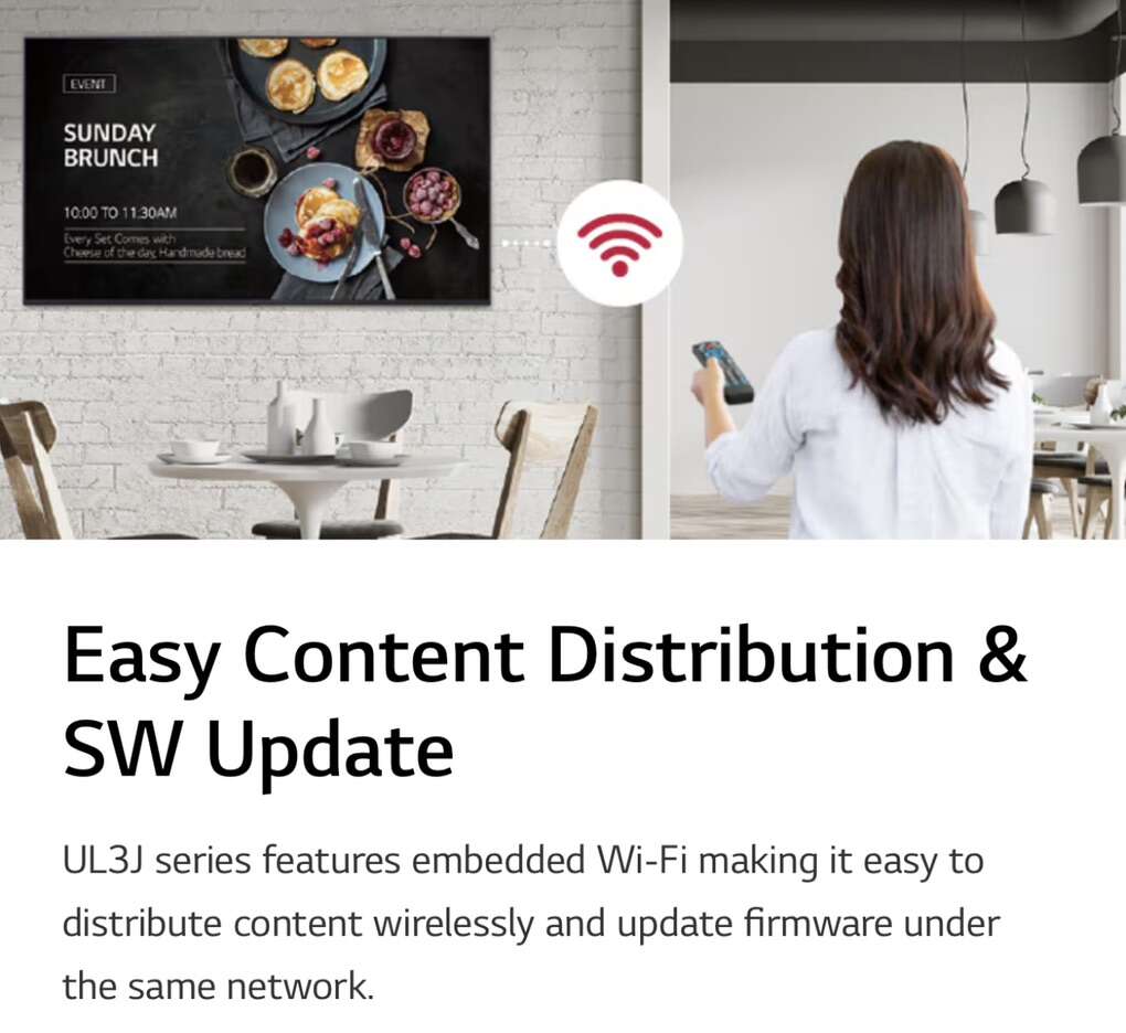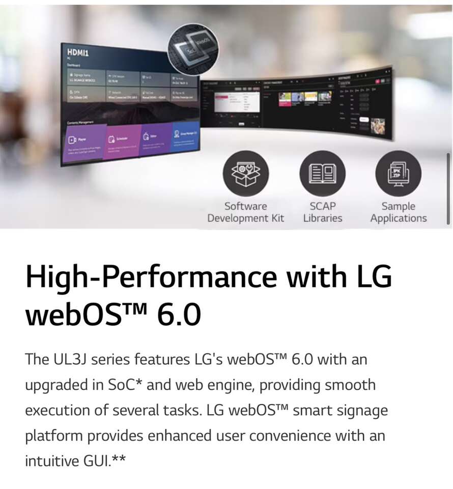 43'' UHD Digital Signage with webOS™ 6.0, Embedded CMS, Portrait/Landscape, Built-in Wi-Fi, Cisco & Crestron Compatible.