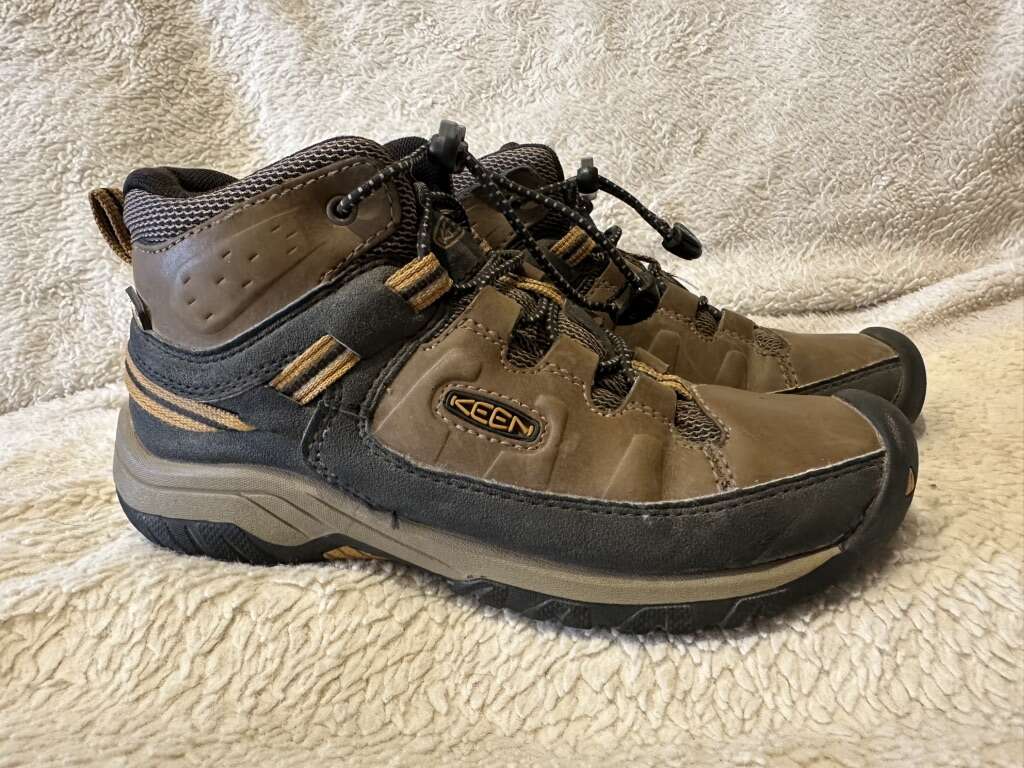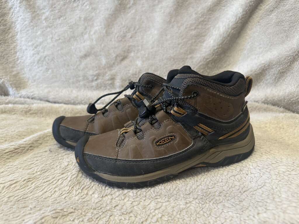 Keen youth, size 4 brown leather and textile waterproof mid hiking boots with elastic laces and a toggle at the top. These are in good condition, see photos for details. I take cash or Venmo, but cash is preferred. Text is best. 801-201-4446. Check out my other ads for additional sizes and styles.