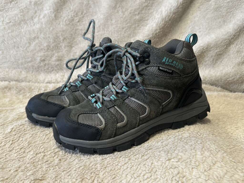 Red Head youth, size 4 gray mesh and leather with beach blue trim waterproof mid hiking boots. These are in excellent condition, see photos for details. I take cash or Venmo, the cash is preferred. Text is best. 801-2014446. Check out my other ads for additional sizes and styles.