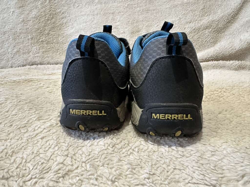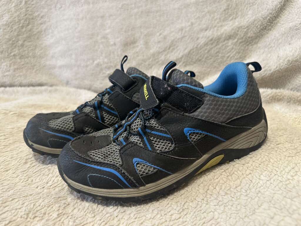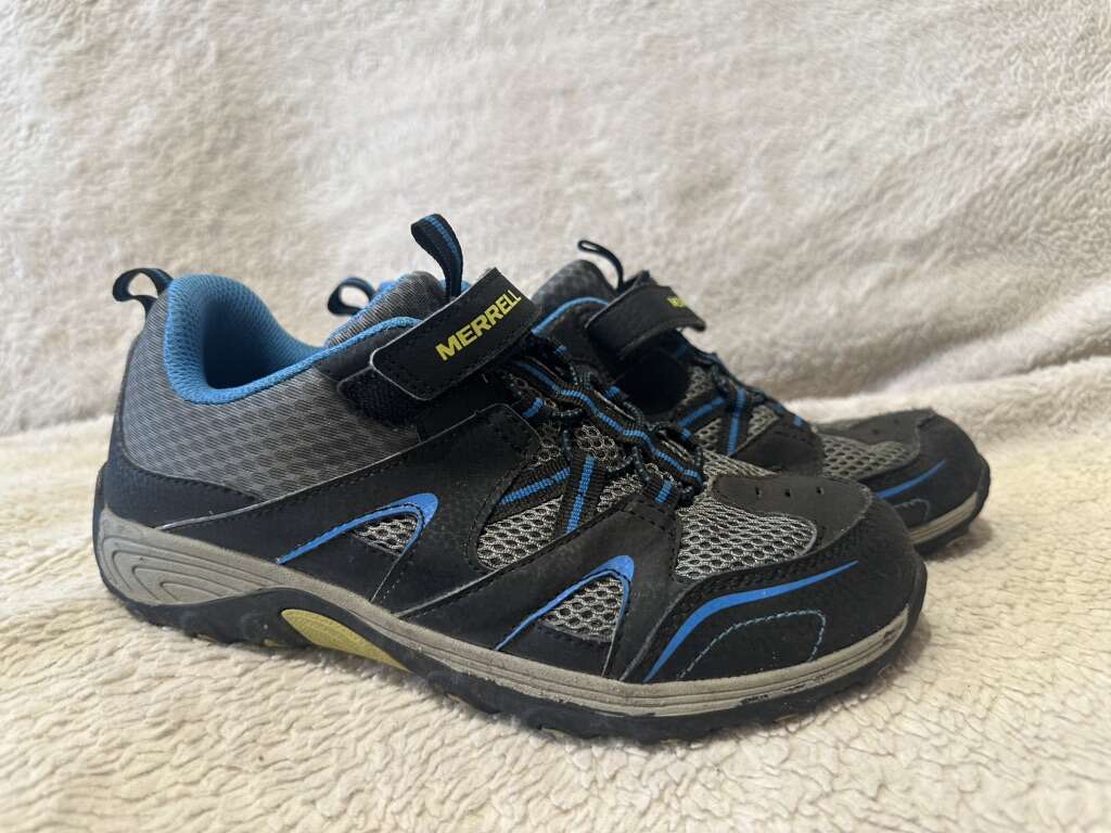 Merrell youth size 5.5 gray/black with blue trim, mesh and leather hiking shoes with elastic laces and a Velcro strap with the top. These are in excellent condition, see photos for details. I take cash or Venmo, cash is preferred. Text is best. 801-201-4446. check out my other ads for additional sizes and styles.