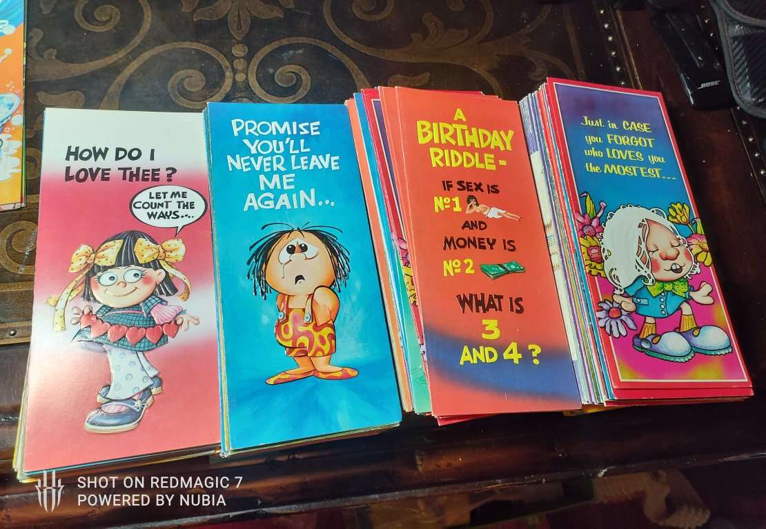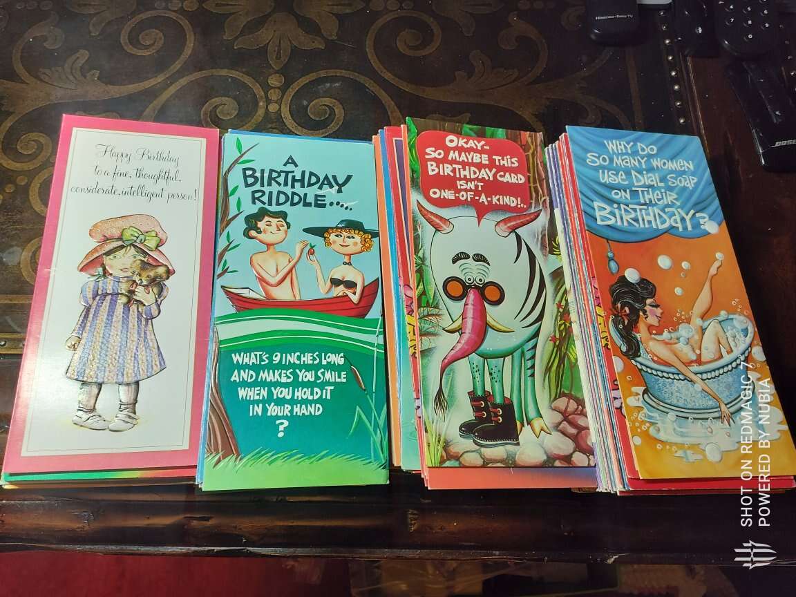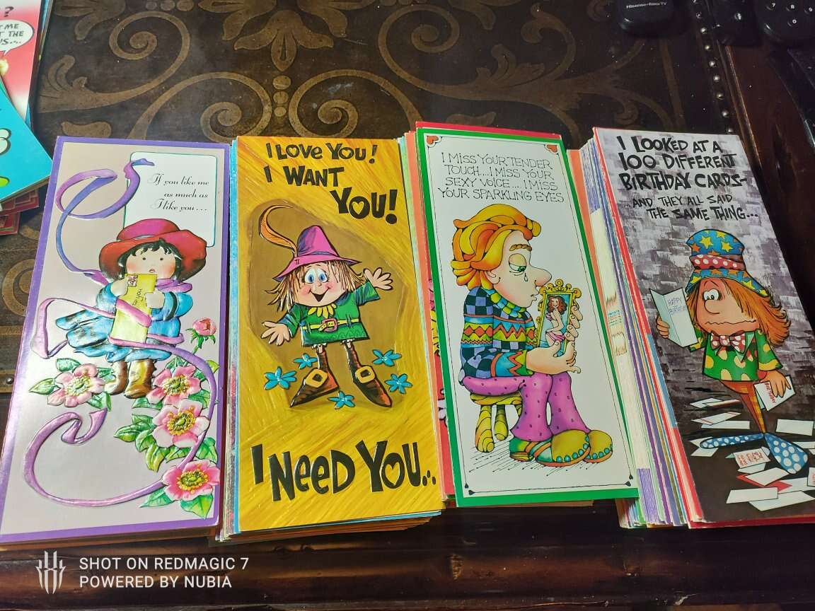 vintage Joli greeting cards lot Unused 9"×4" Vintage Greeting Cards,Velvety Textured . most of the cards are 70's birthday, marriage,love, anniversary etc. cards has some wear, corner and edge wear, creasing, has no envelope, and is unused.