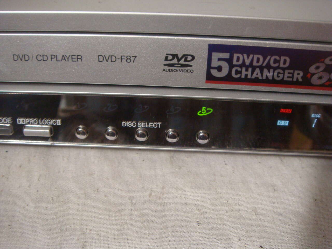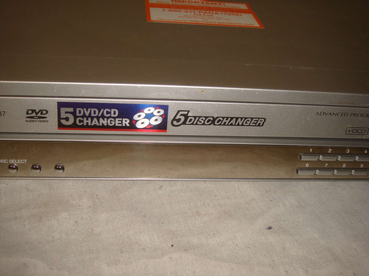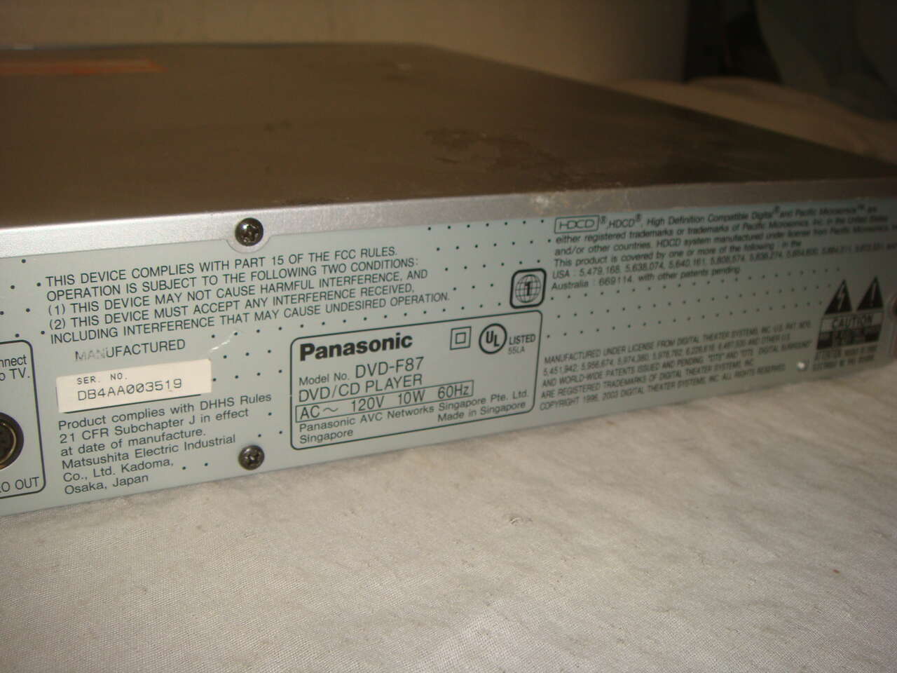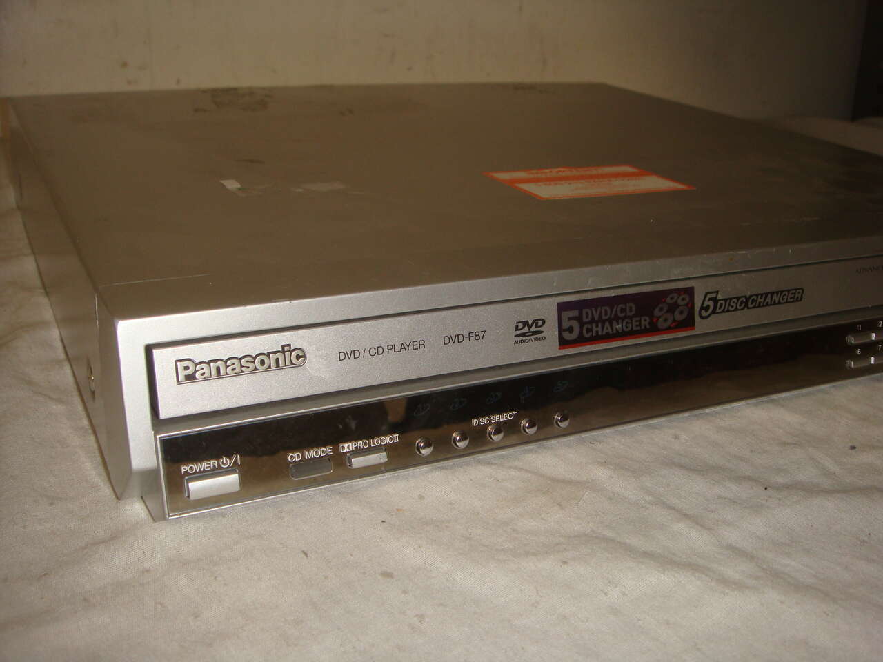 PANASONIC DVD-F87 5 DISC DVD/CD PLAYER. This is a used CD/DVD player that has some surface marks, sticker residue, and signs of use. Overall it's in good condition. It powers up, loads discs, plays perfectly, and sounds great! It is the player only without any accessories. We did not get a power cord with it, so you'll need one of those, but it uses a very common figure 8 style cord that you can get on Ebay for $3. It comes with everything shown. This is your chance to save big-time so don't miss out!!