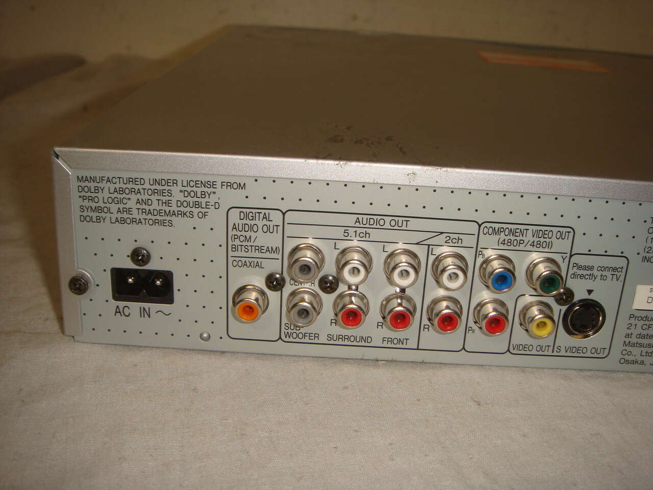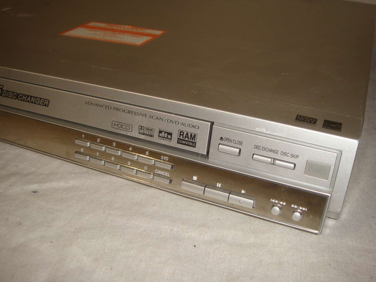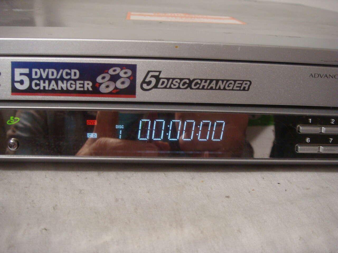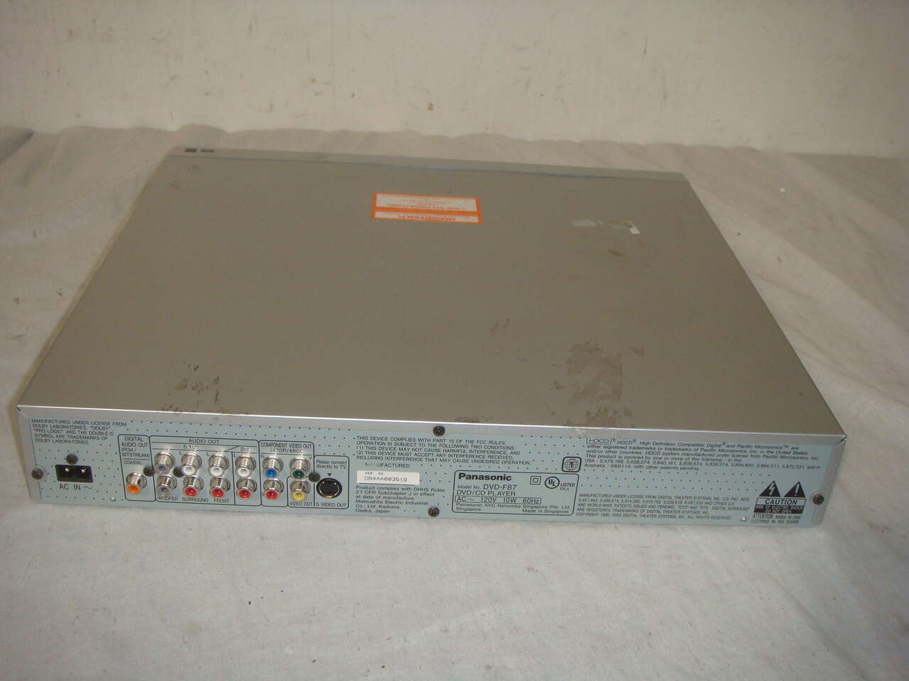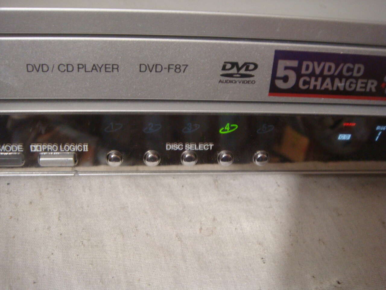 PANASONIC DVD-F87 5 DISC DVD/CD PLAYER. This is a used CD/DVD player that has some surface marks, sticker residue, and signs of use. Overall it's in good condition. It powers up, loads discs, plays perfectly, and sounds great! It is the player only without any accessories. We did not get a power cord with it, so you'll need one of those, but it uses a very common figure 8 style cord that you can get on Ebay for $3. It comes with everything shown. This is your chance to save big-time so don't miss out!!