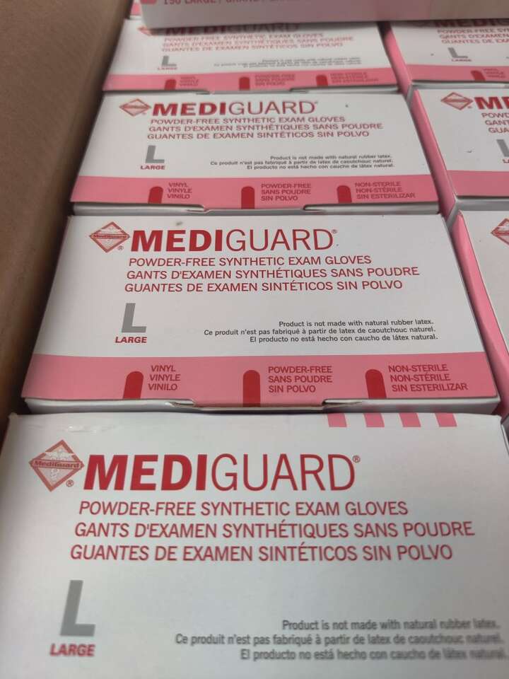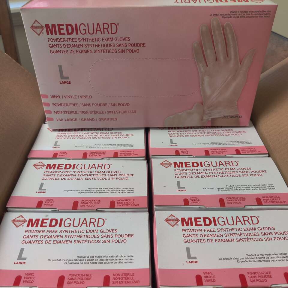 MediGaurd Vinyl Gloves New Case of 10 Boxes 150 per box. 1500 total Size Large Manufactured: 02/2021 A few cases available.