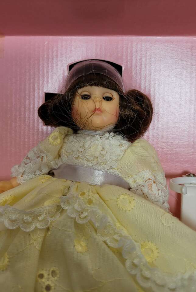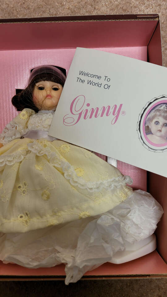 VenmoGinny Little Miss Muffett #71-0505 was made by the Vogue Dolls a division of the R.Dakin & Company in 1986. She is new, never removed from box. She has original netting over her face and hair, accessory pieces and original hang tag. The box is in excellent condition, the only damage is where the tape has pulled up. She comes from a smoke free environment where she has been stored away from light.