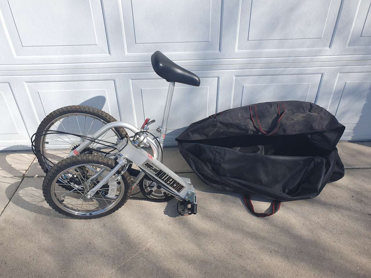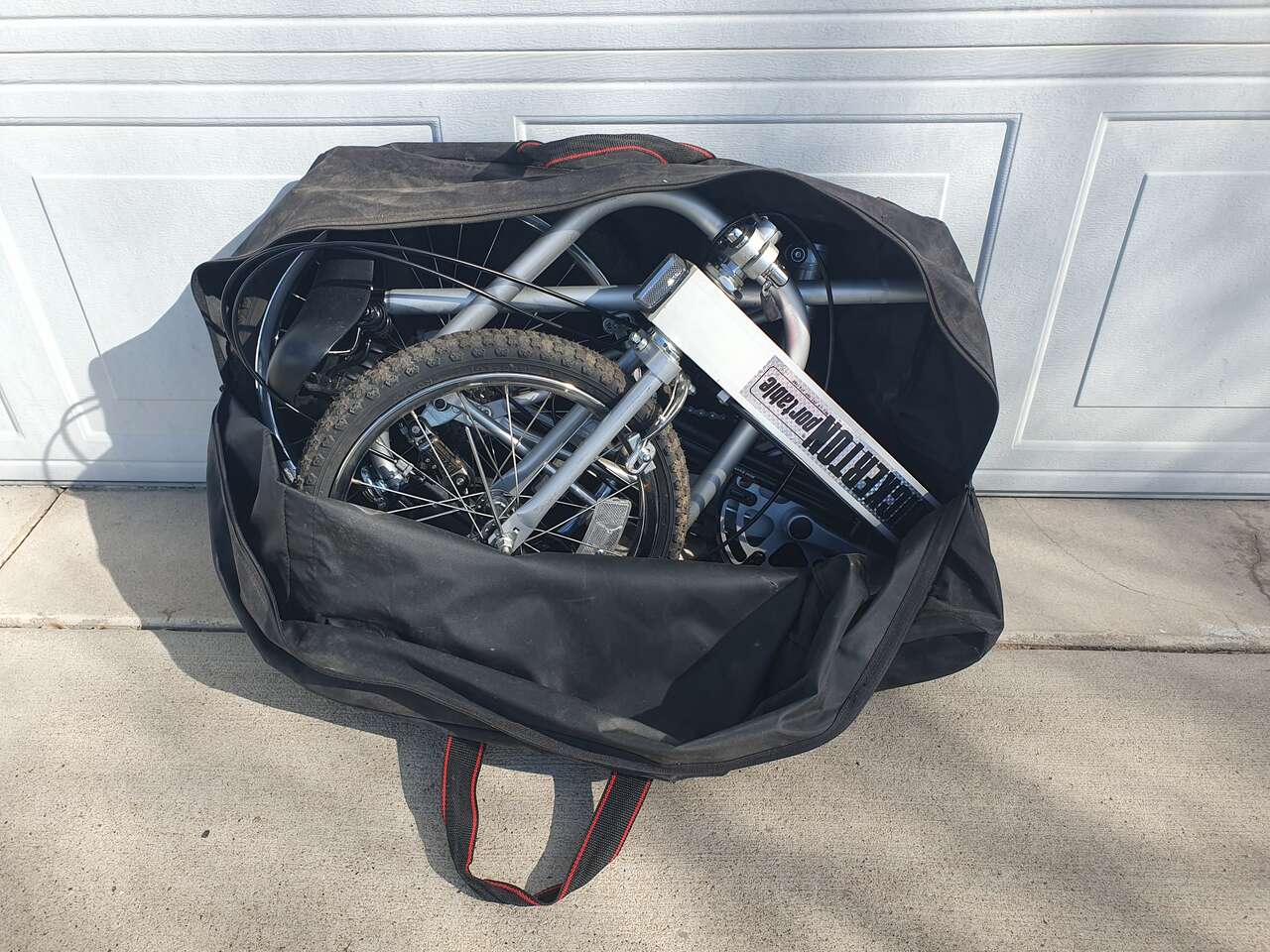 This bike folds up and fits inside a bag about the size of a medium suitcase. It is lightweight with easy to carry handles. It can be stored in a car trunk, closet, apartment, or RV compartment.