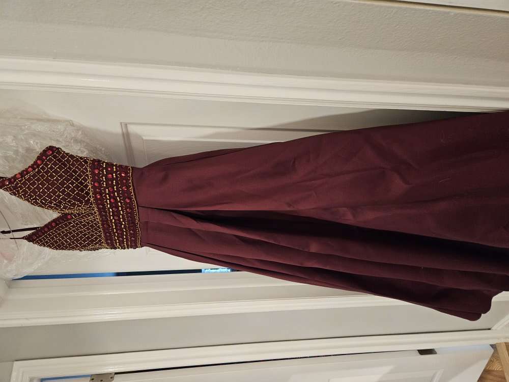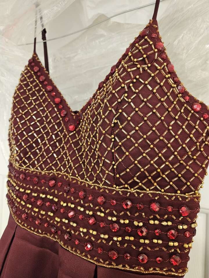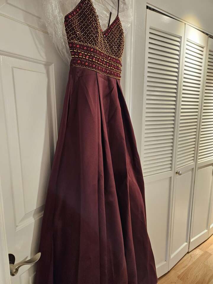 maroon and gold size 3/4, ankle length prom dress with pockets!