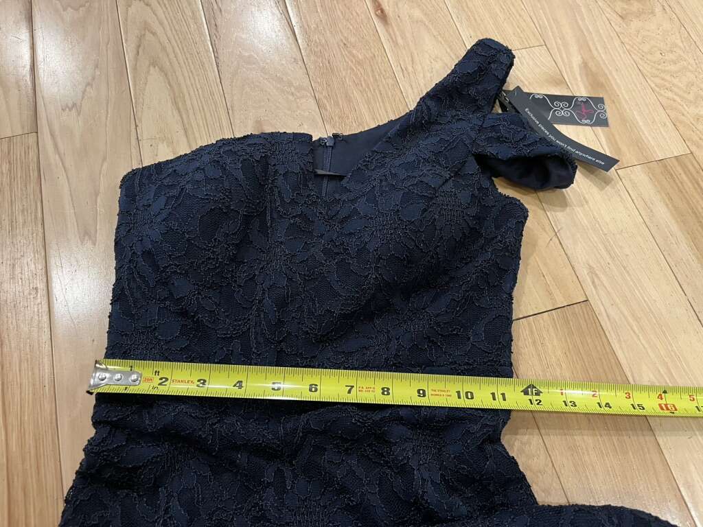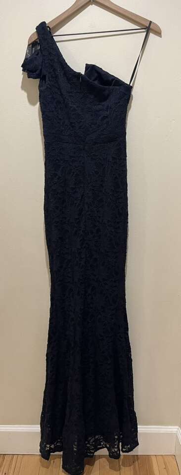 Aqua Brand NWT Navy Blue Single Shoulder Lace Fluted Long Maxi Formal Gown Dress - Women’s Size 0 - Style A21449 - lace overlay with solid under slip - with back zippered closure - brand new with tags. MSRP $258.00.