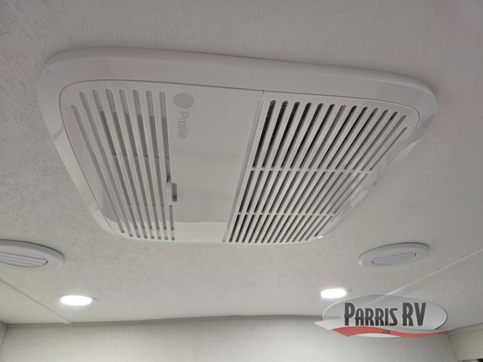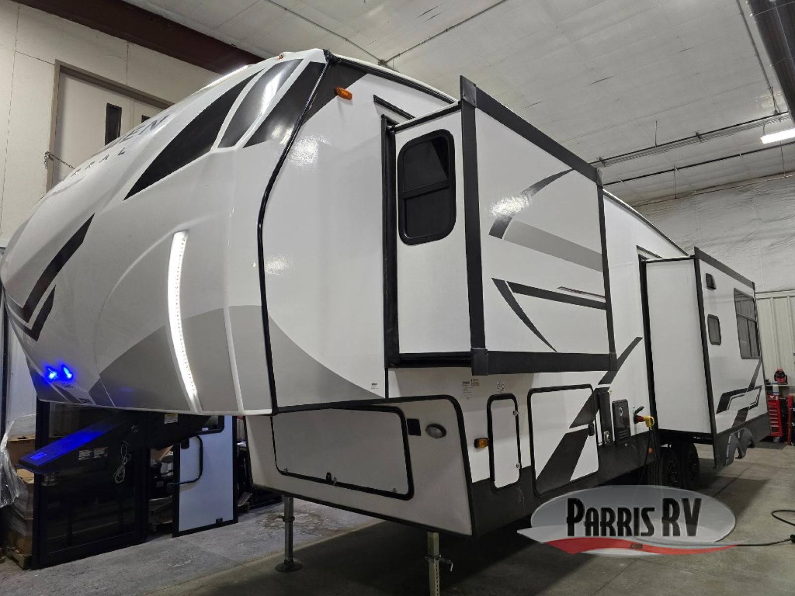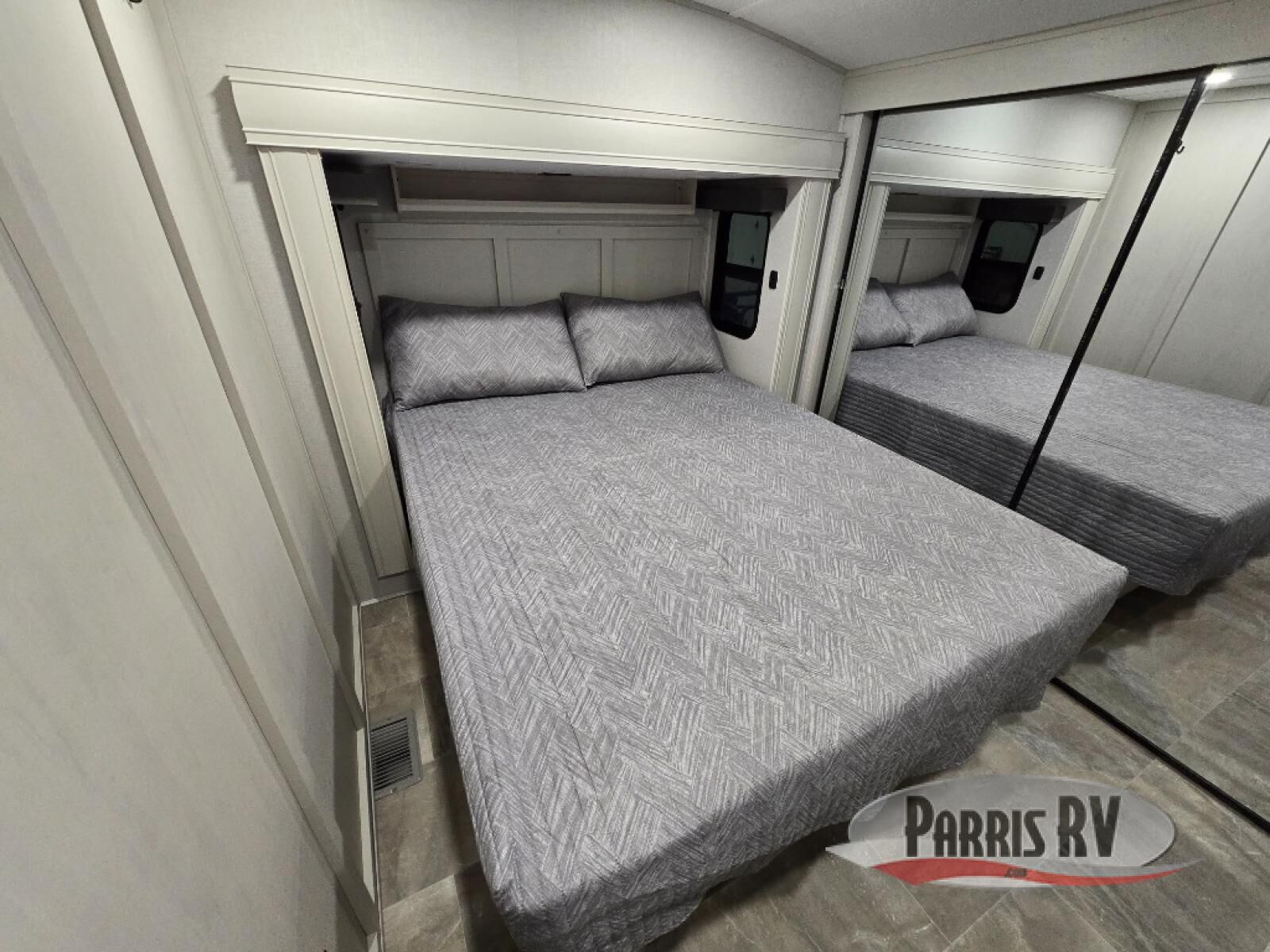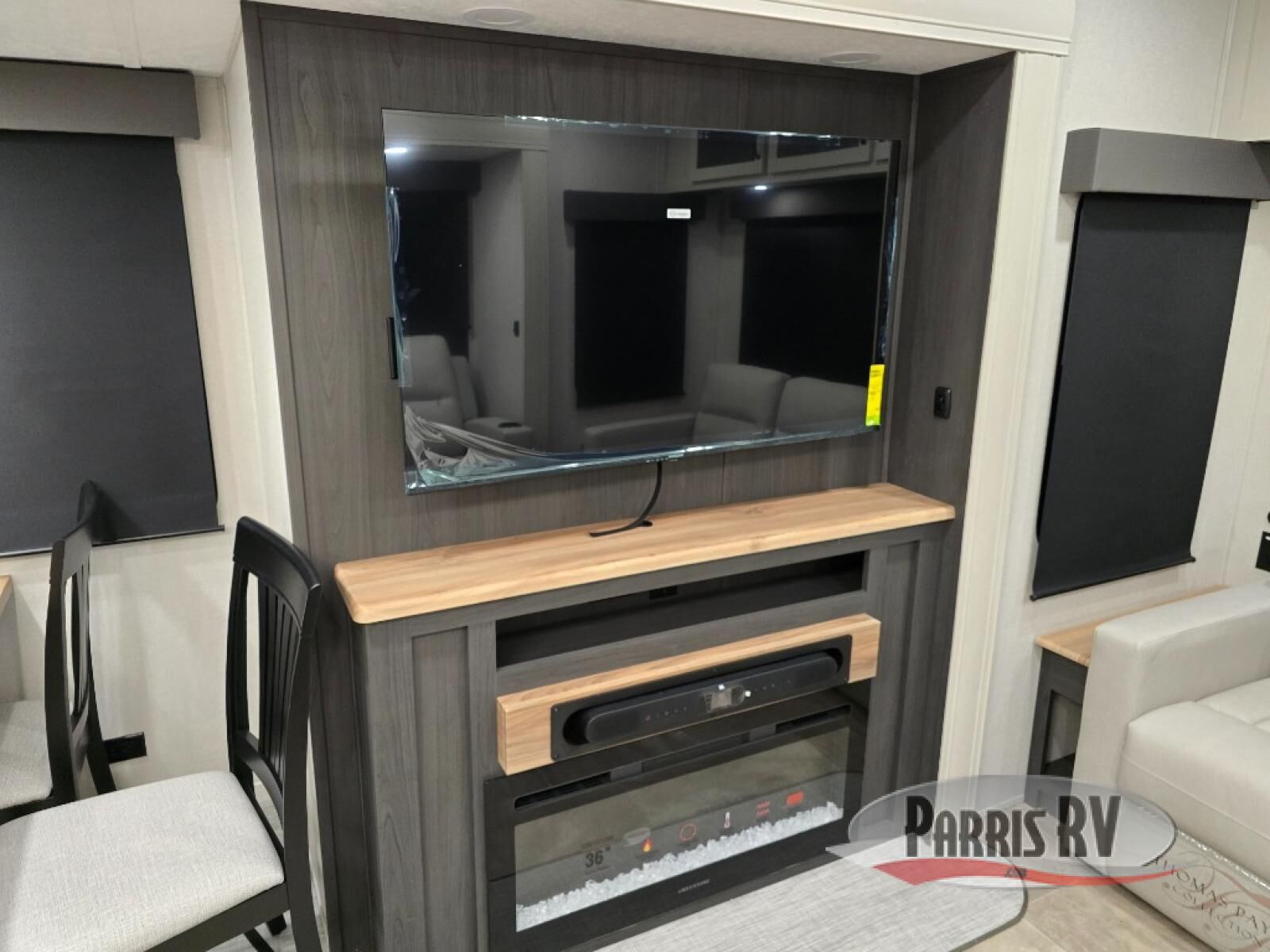 This lightest fifth wheel in the Chaparral line-up will provide hassle-free towing and camping. You will find dual opposing slides in the main living area for tons of space to stretch out, plus a kitchen island that will make this area feel more like home. There is theatre seating across from the entertainment center, and you can enjoy the 50" 4K Smart LED TV for movies. The fully-equipped kitchen includes a GE Profile stainless steel 30" residential microwave, a GE Profile 21" oven with a residential cooktop, and a overhead storage to keep kitchen necessities close by. And don't overlook the front private bedroom with a queen bed, dresser, plus a large wardrobe with washer and dryer prep!