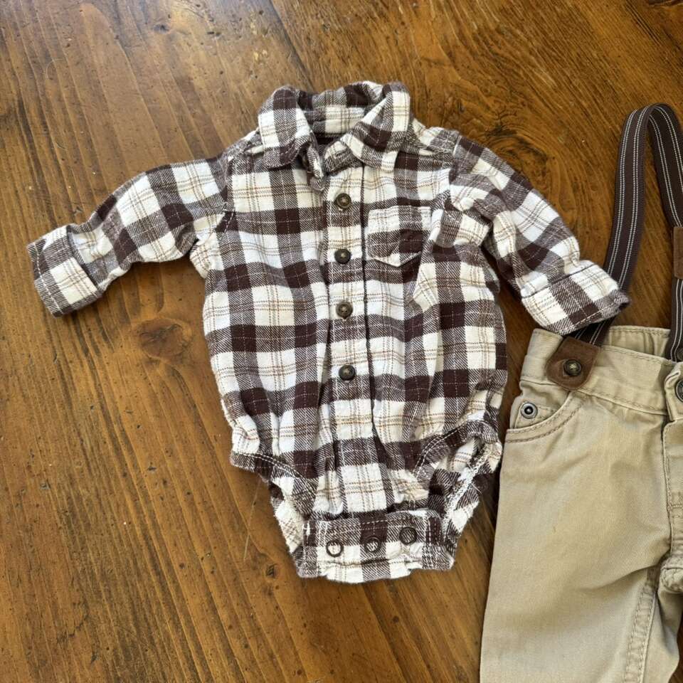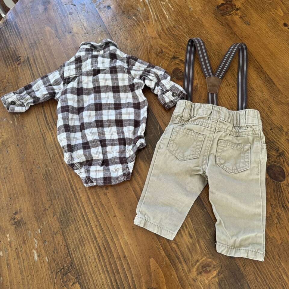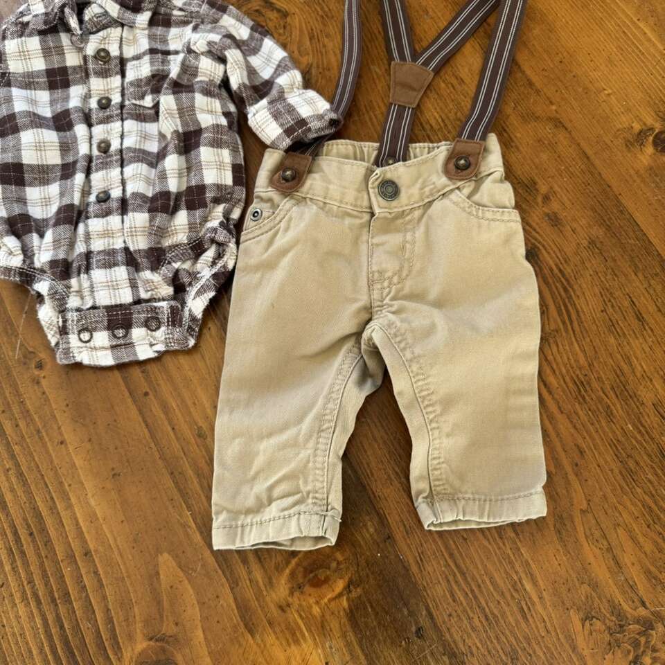 Carter's Baby Boys' 3 Piece Brown Dress Me Up Set Newborn Plaid Long Sleeved Button Down Shirt Khaki Pants Suspenders