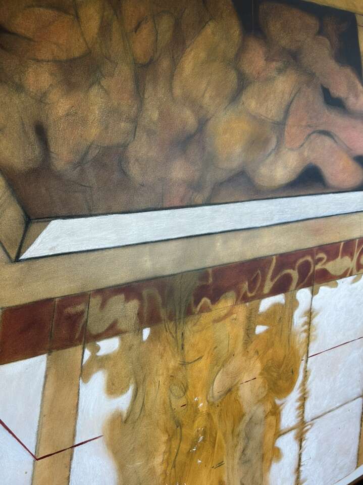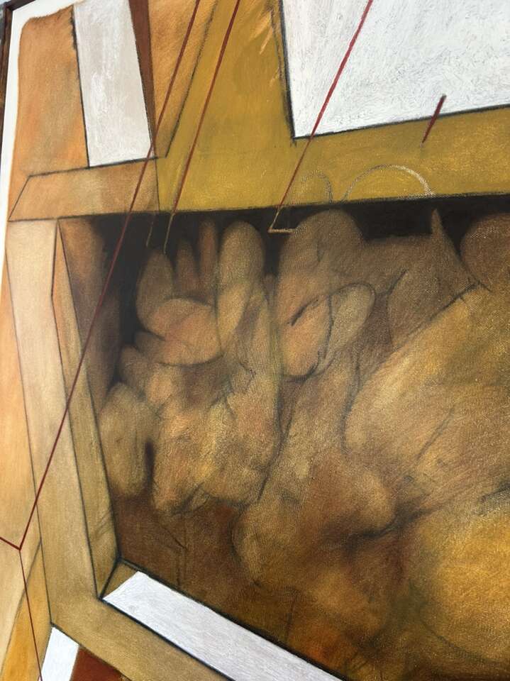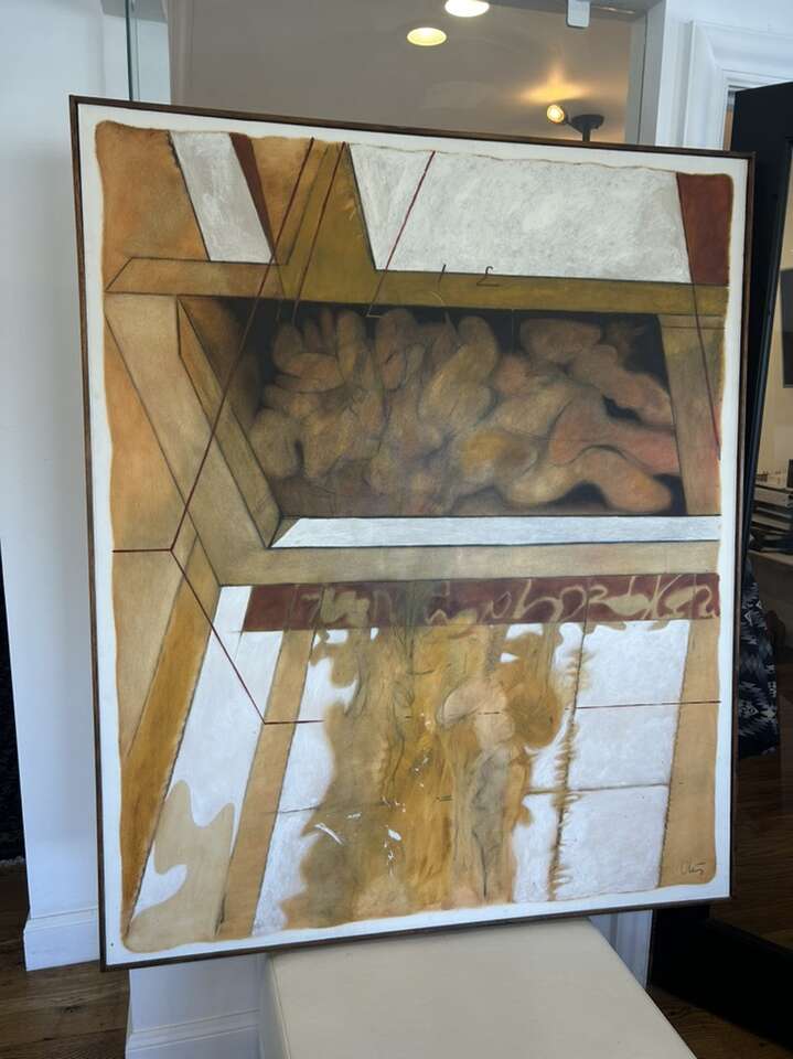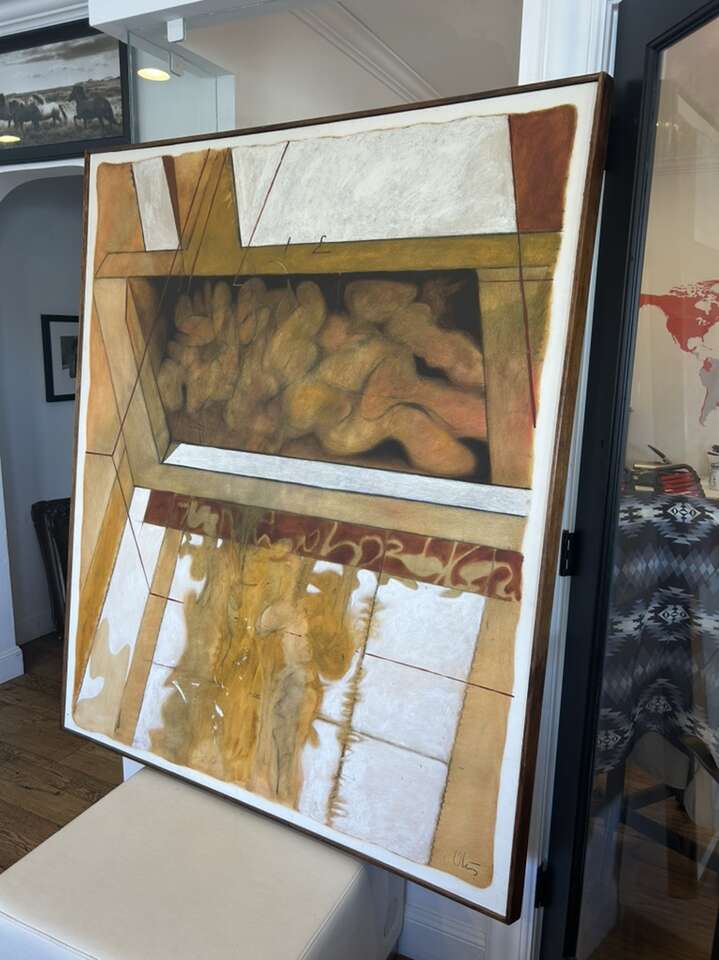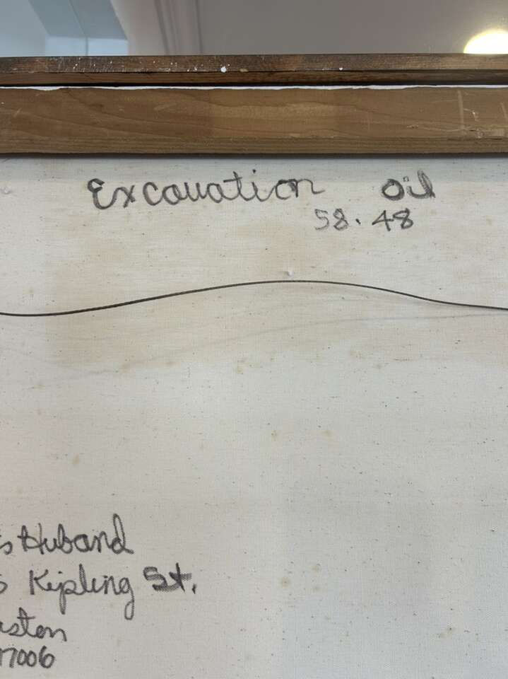 ZelleThis beautiful oil painting on canvas by Otis Huband is a one of a kind piece of art. The painting depicts an excavation and is signed by the artist. It is framed and measures 49 inches in length, 59 inches in height, and 2 inches in width.