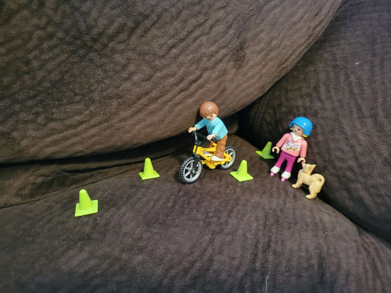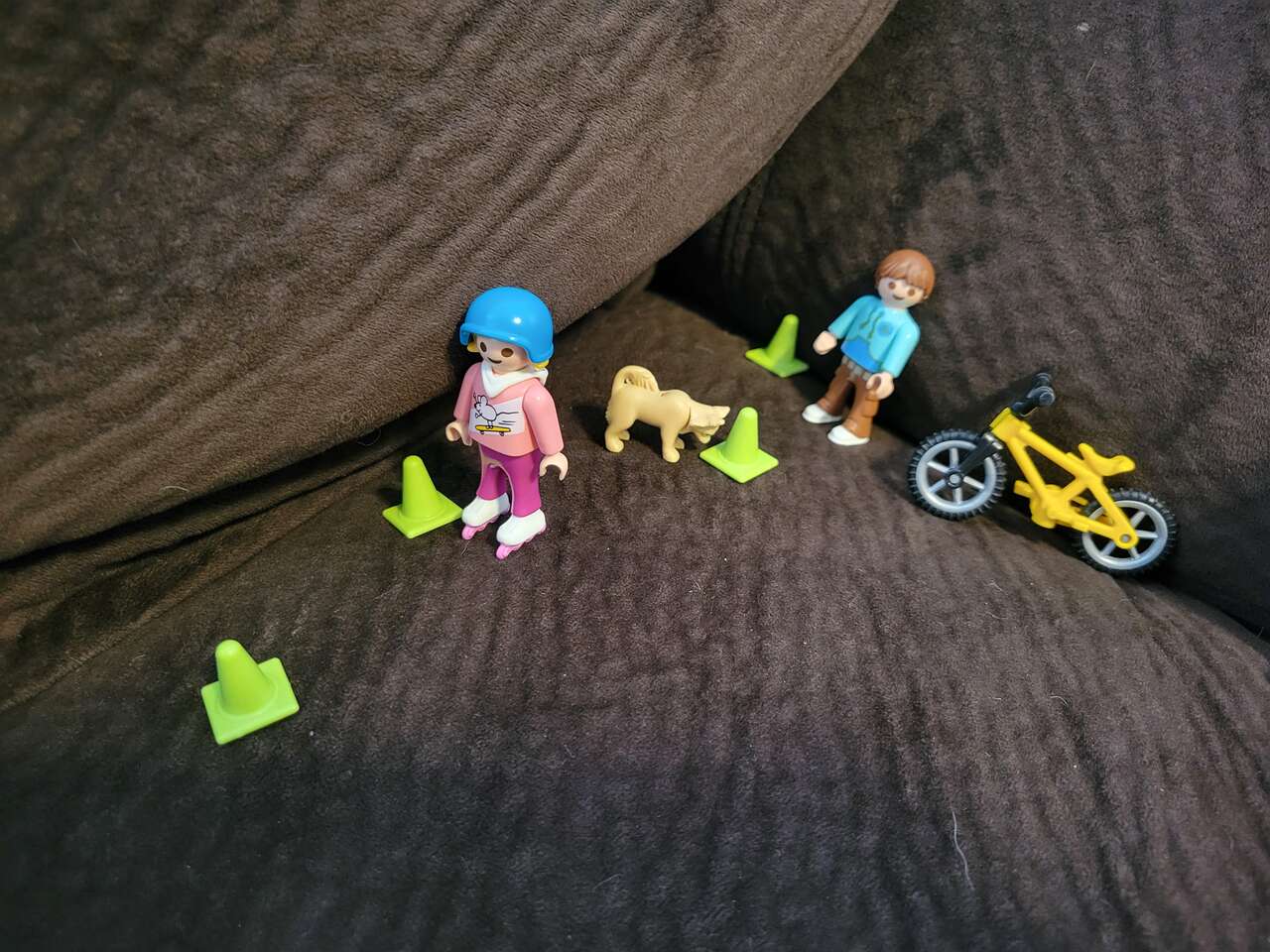 Boy and girl Kids with Bike, Skates, helmet and Safety cones