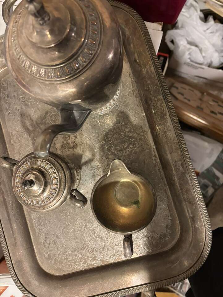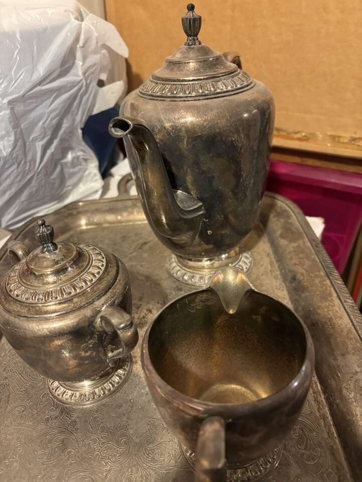 PayPalFenwick WM Roger’s 1950s silver plated coffee/tea set with tray, sugar and creamer. #1202,1203,1204. The tea pot has a hinged lid. I think the number on the tray is 1211. $70.00 obo. It needs to be cleaned up as it is tarnished.