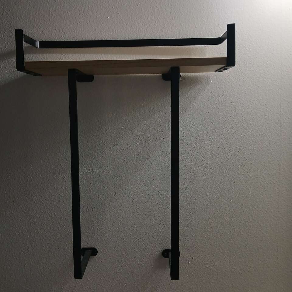 VenmoModern shelf, great for storing towels in the bathroom, or whatever else. Vertical bars measure 15.75 inches in length. Shelf is 15.75 inches wide and 5.25 inches deep. Redoing my bathrooms and this is not included in my plans. I also have a smaller one, similar style, see my listings. $7. Cash or venmo. Check out my other listings!