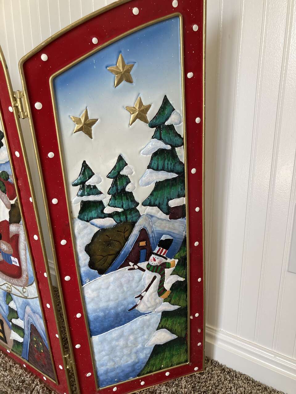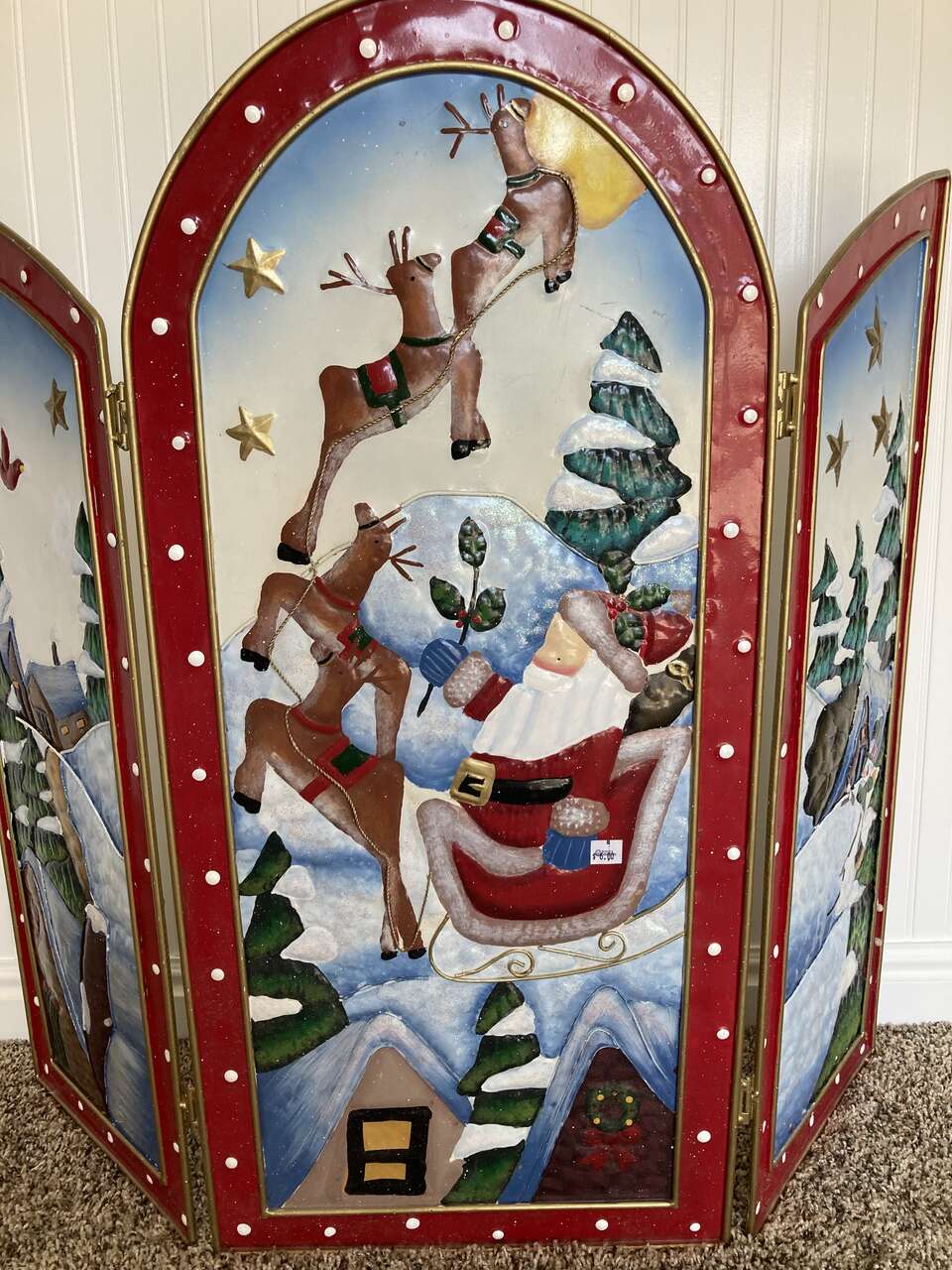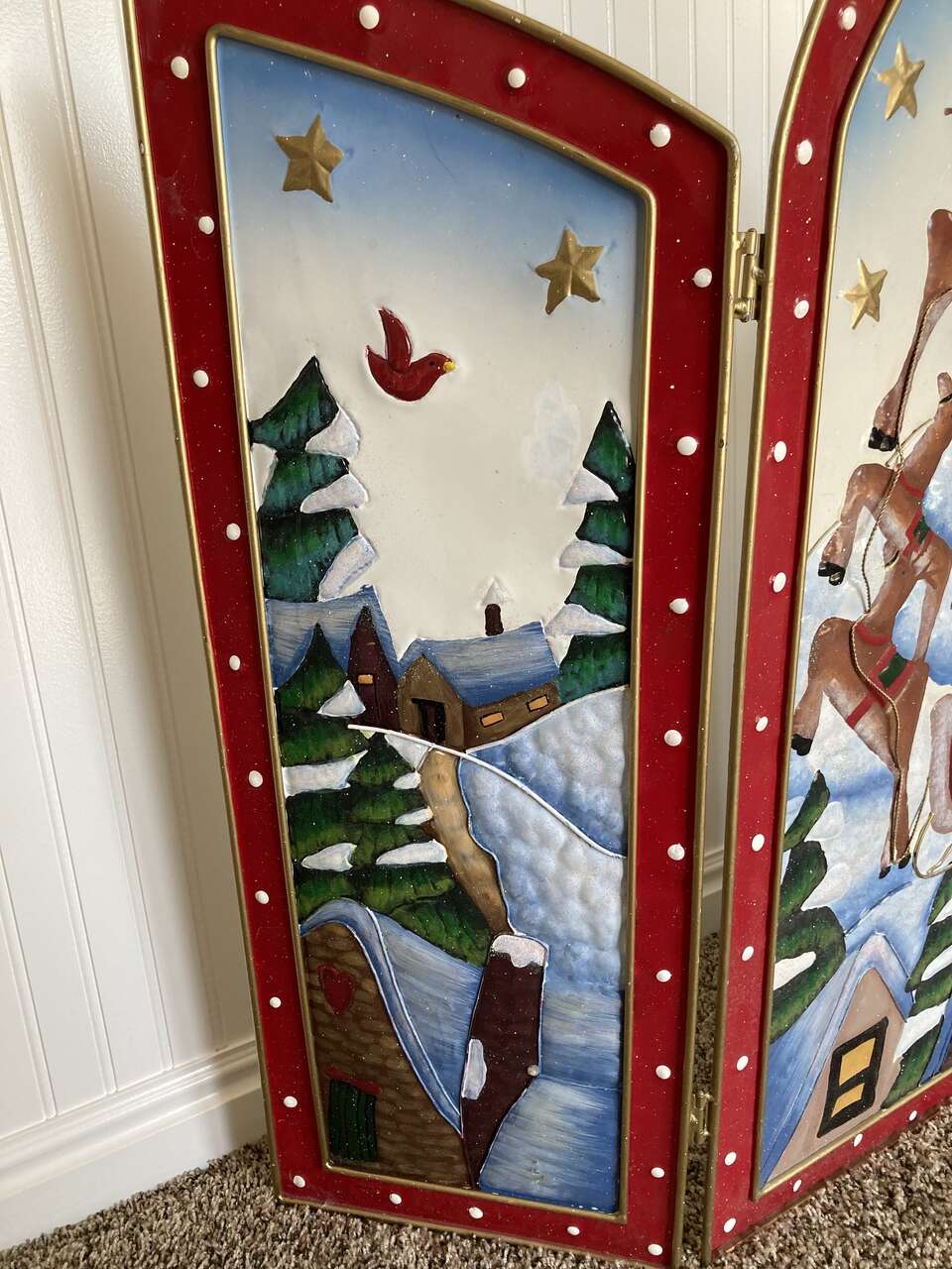 Beautiful Hand-painted CHRISTMAS Fire Screen - It can be set anywhere in a home to bring in the holiday feeling! 31.5 inches tall 36 inches wide when open all the way.