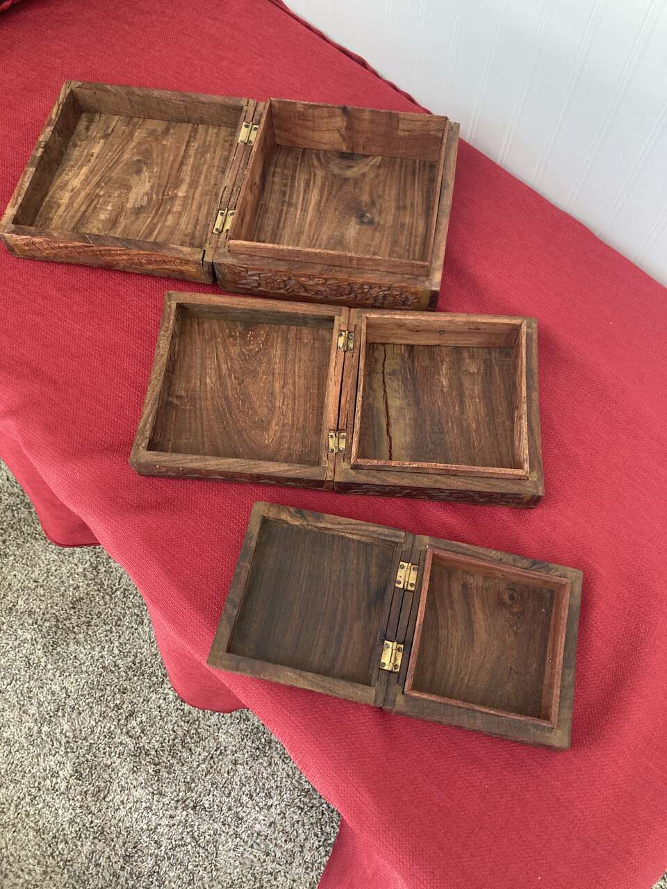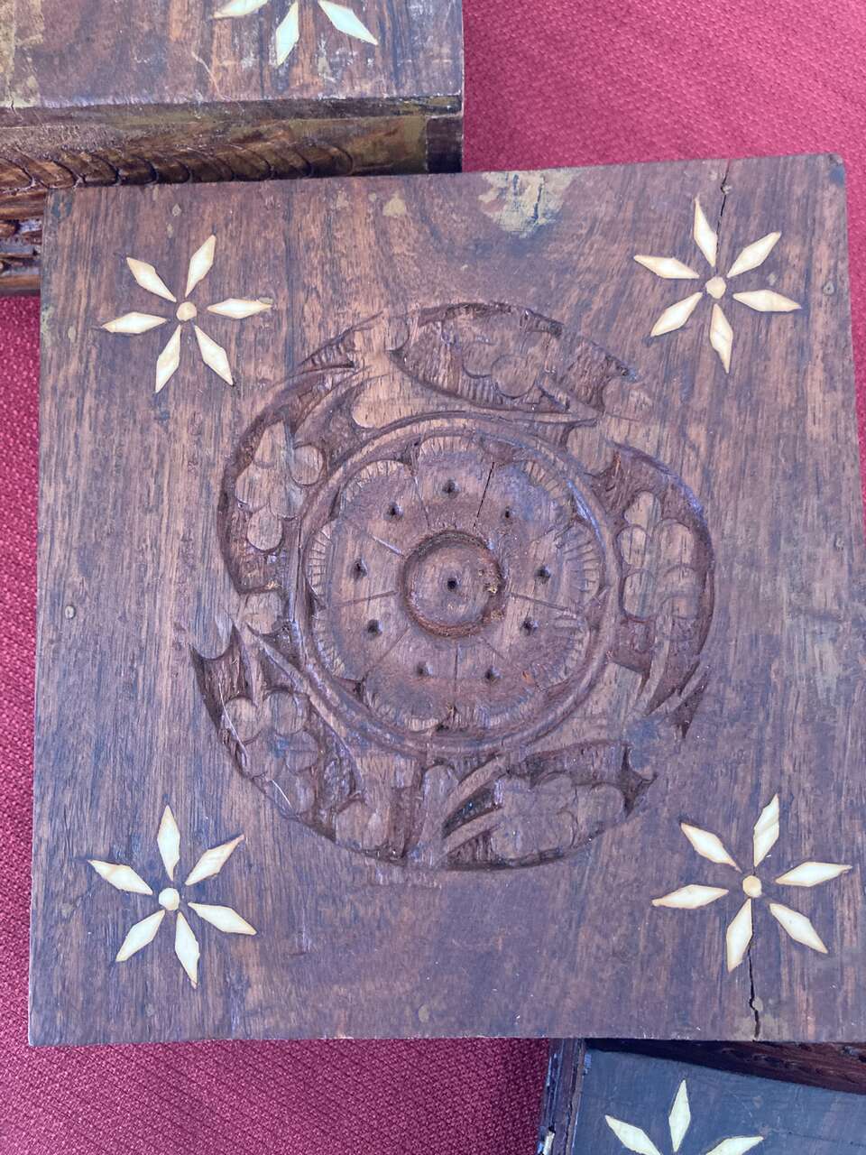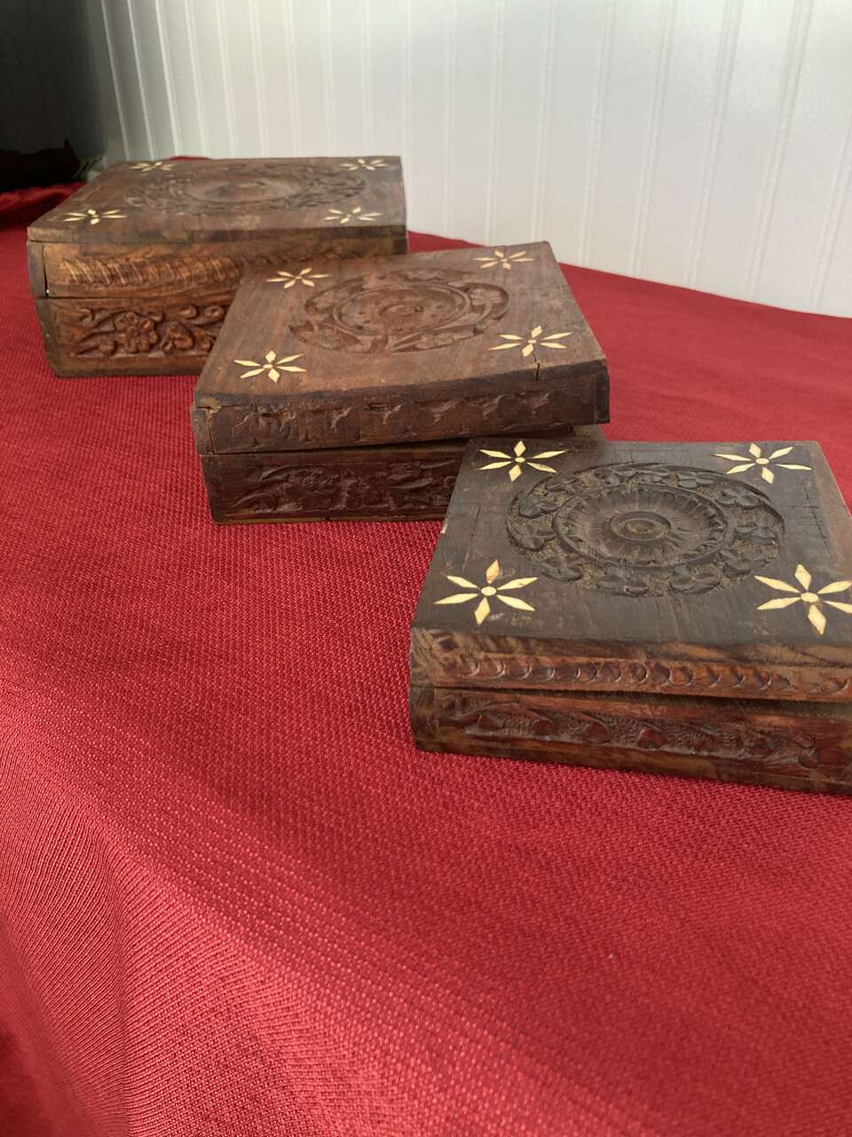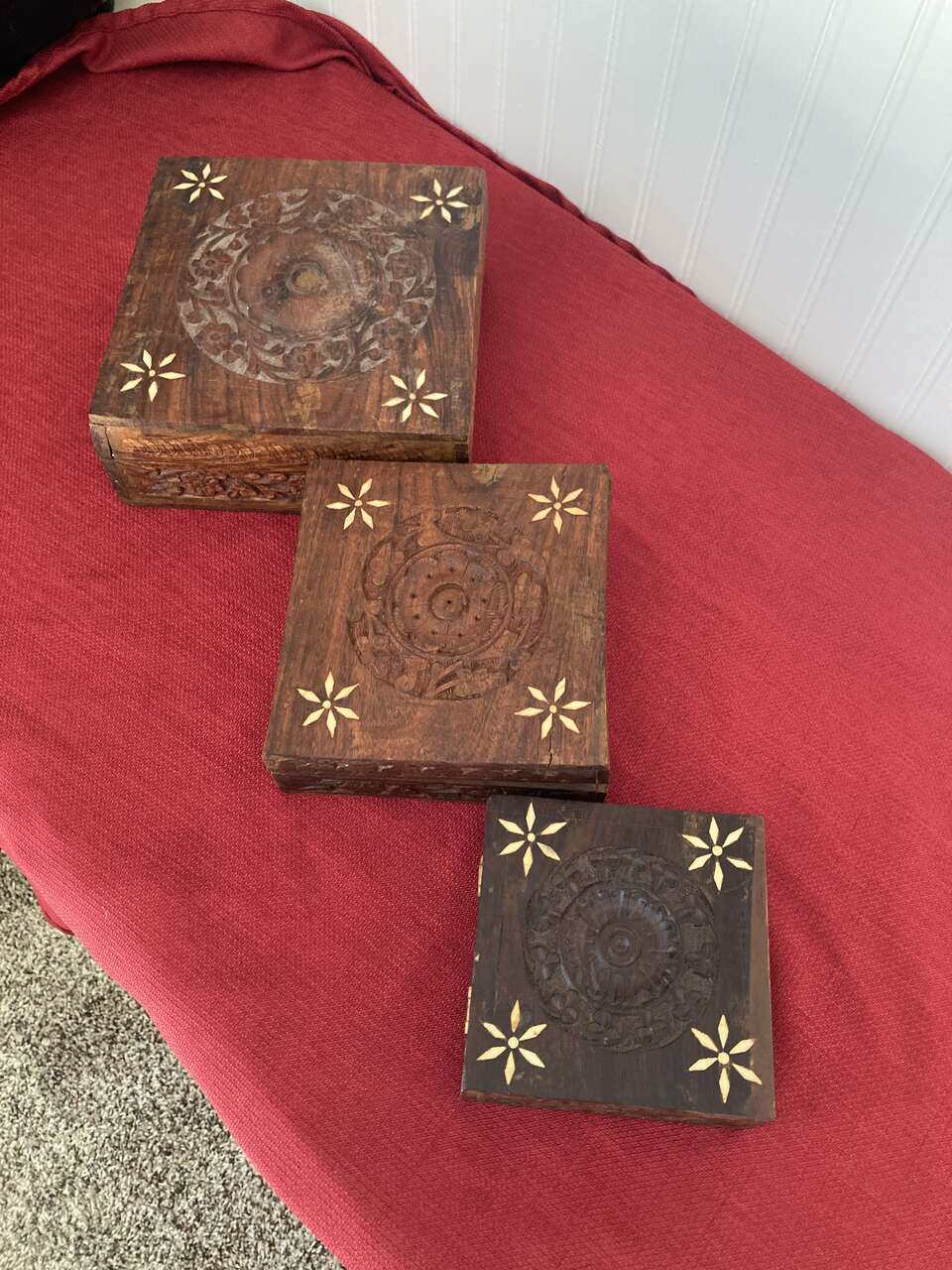 3 Rosewood Nesting Boxes - Hinged lids, Inlaid Flower Pattern on all three lids