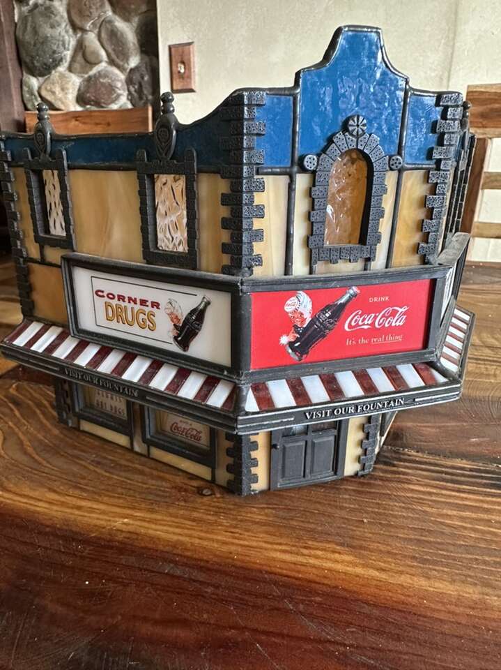 Stained Glass, Coca-Cola Corner drug Store. Coca-Cola brand. Stain glass with a light for the inside. Does not have a box. 6” X 5” and 6 1/2” tall. It is numbered on the back plate. CASH ONLY!
