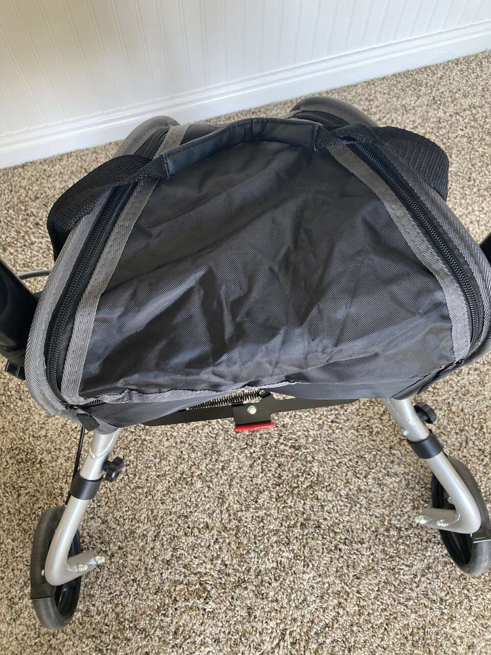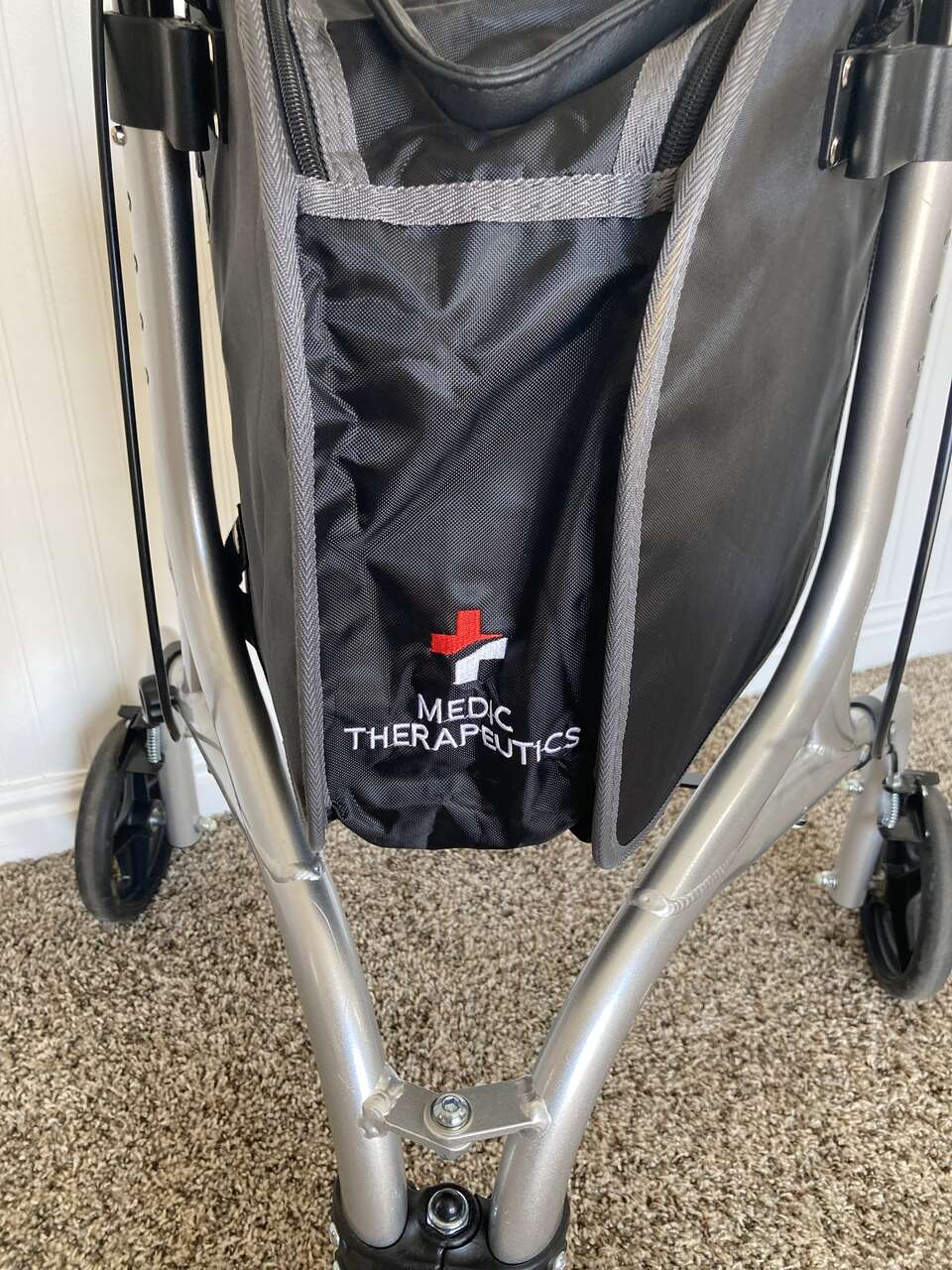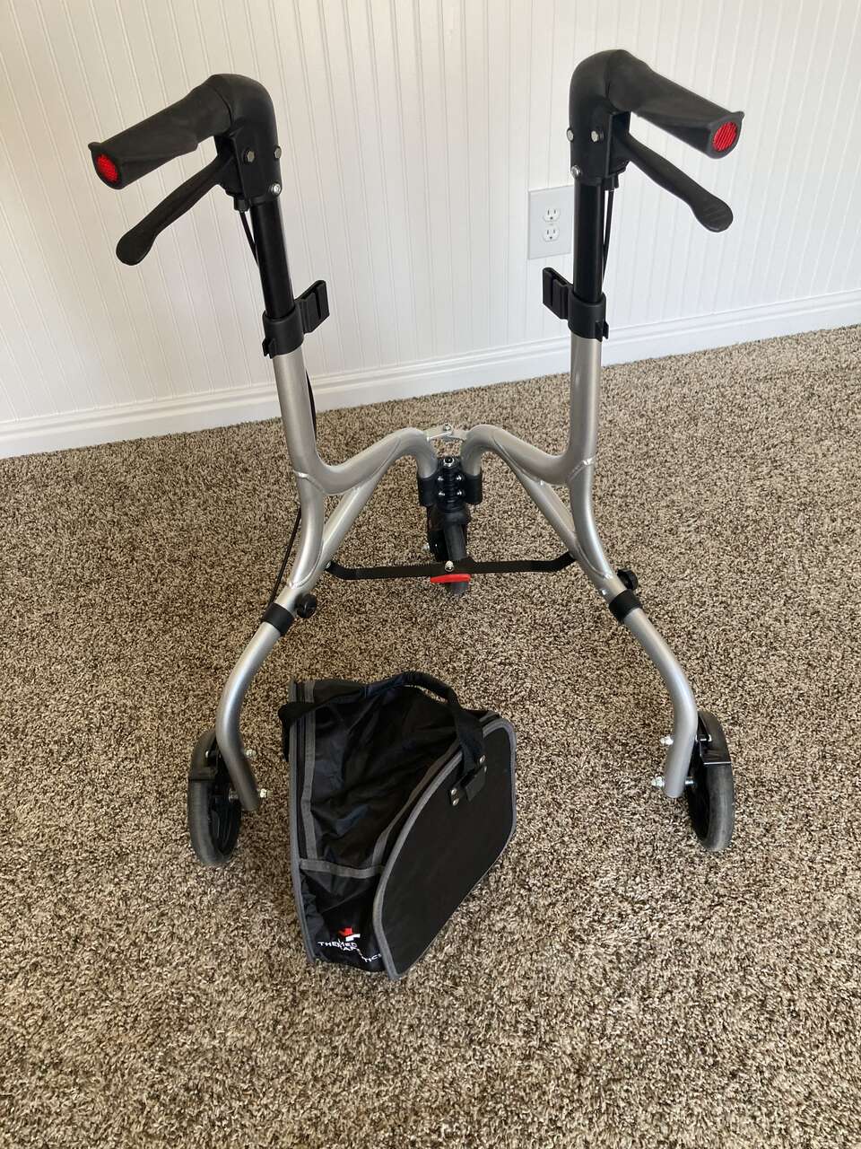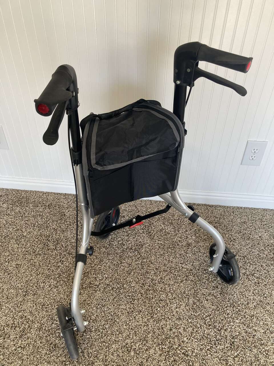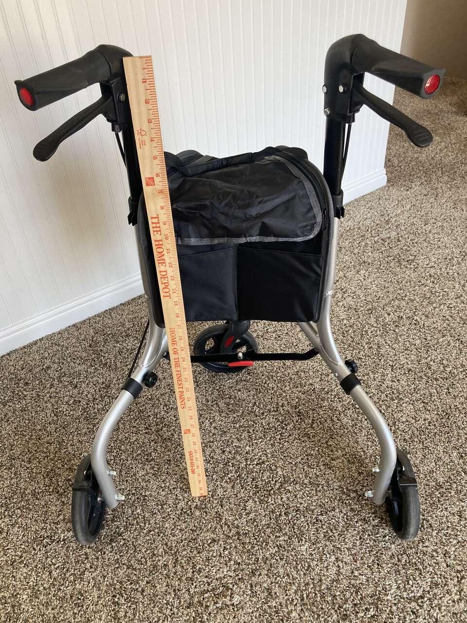 This 3 wheel Rollator is a wonderful mobility aid and will support up to 250 lbs. It has hand breaks that are lockable. very gently used, in new condition! Stands 36 inches high