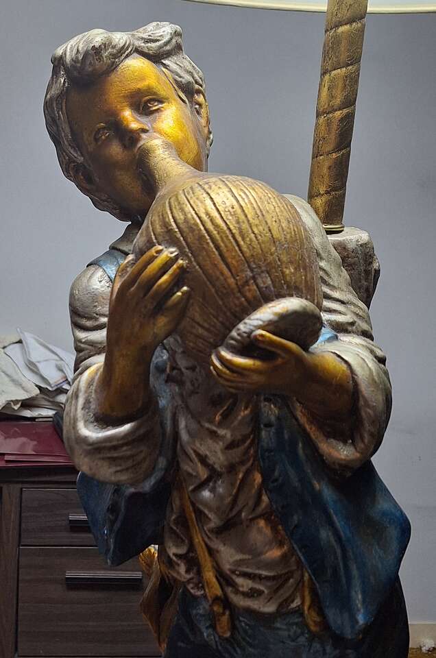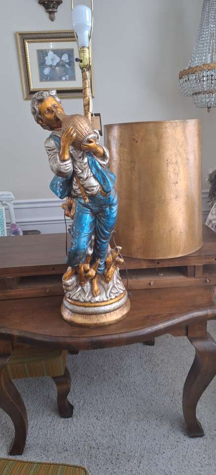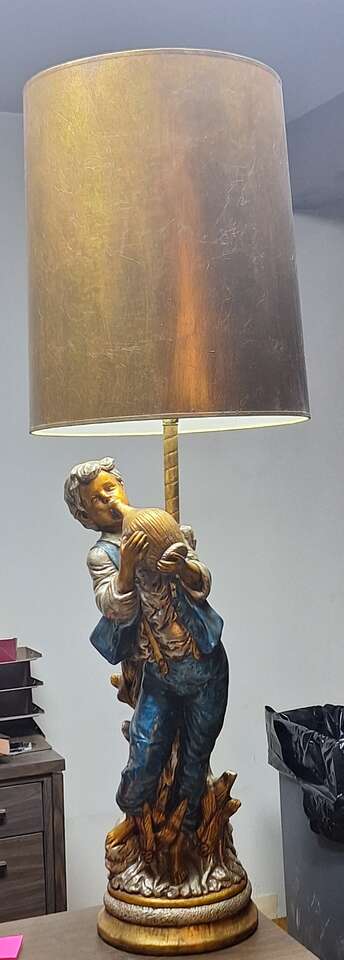 Mid Century Vintage Statue Lamp - Boy with Jug - in good condition. Approximately 4.5 feet tall including shade. Cash only.