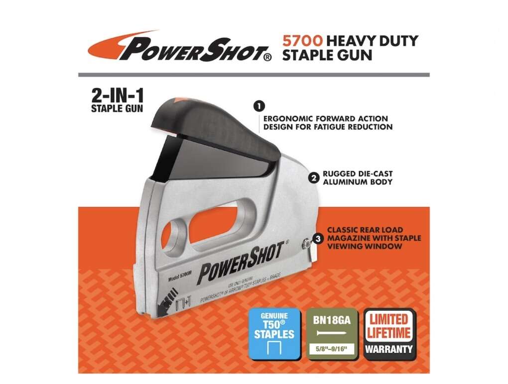 The PowerShot Forward Action Staple Gun unique design eliminates squeezing. It shoots 6 types of T50 staples and drives 9/16 in. brad nails. It utilizes 7 types of power shot staples with a 9/16 in. drive. The visual refill window makes checking staple levels convenient. The chamber mechanism allows for easy loading and a contour design offers a comfortable grip. It is a great tool for upholstery, screening, roofing and wiring tasks.