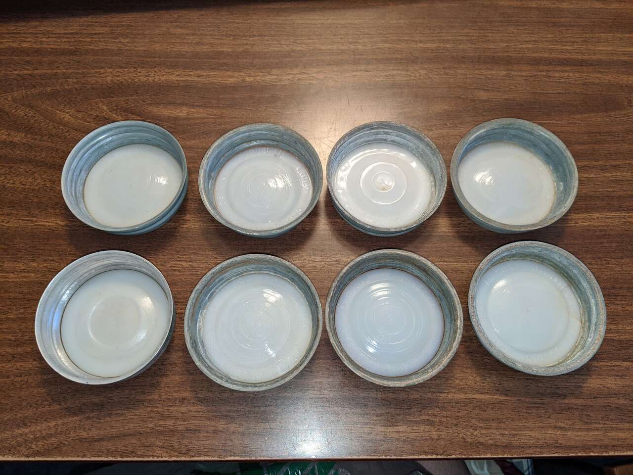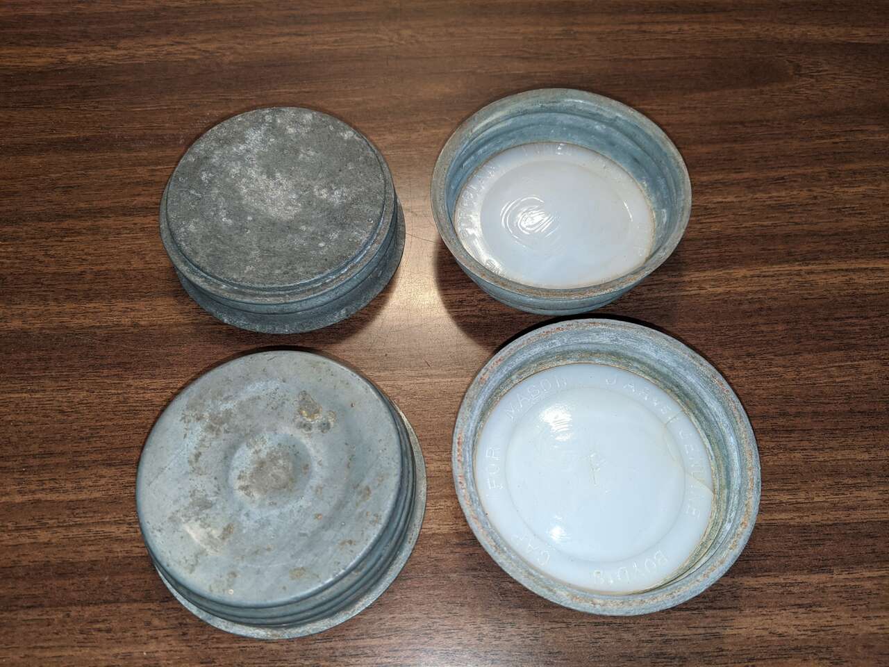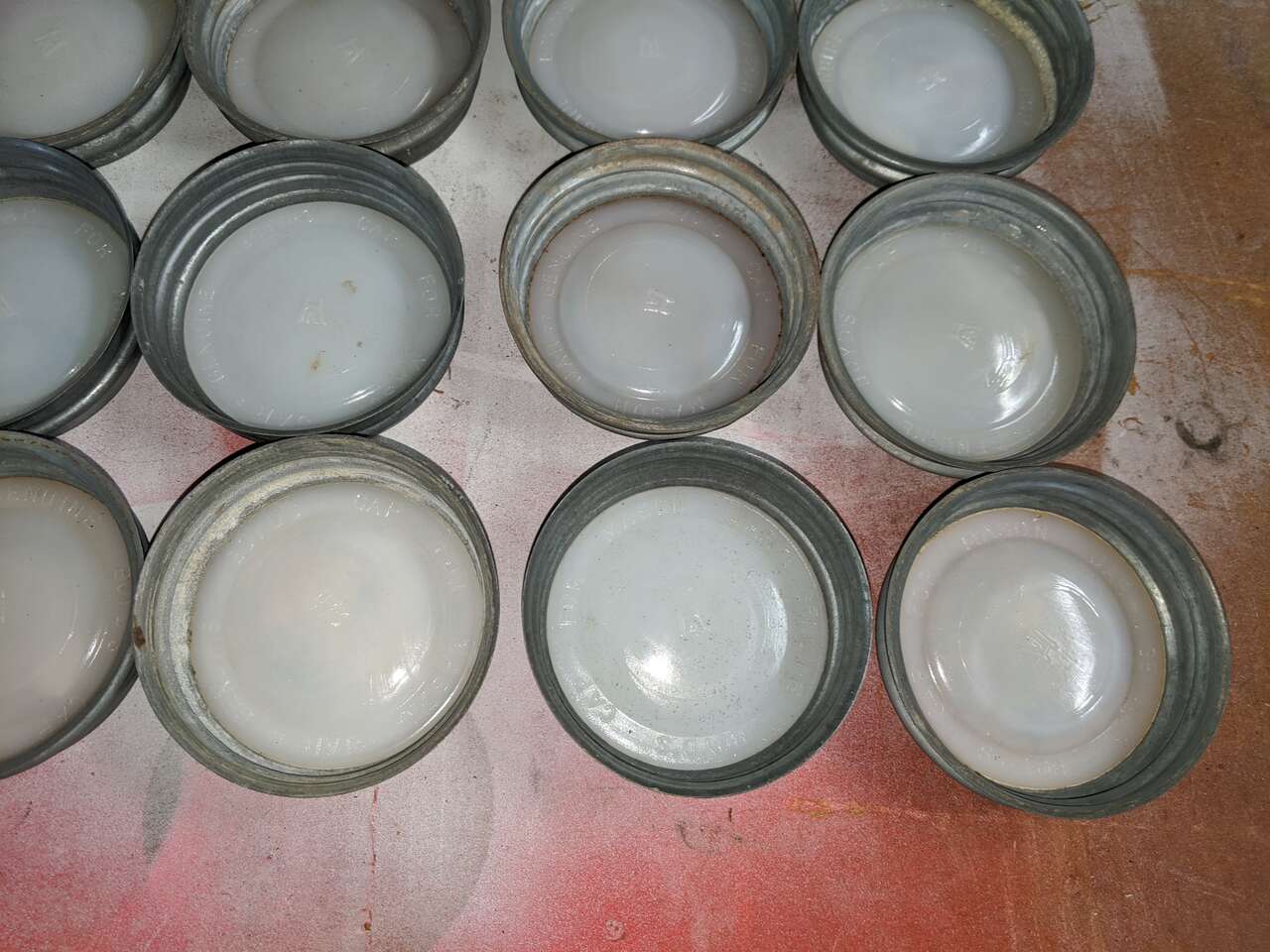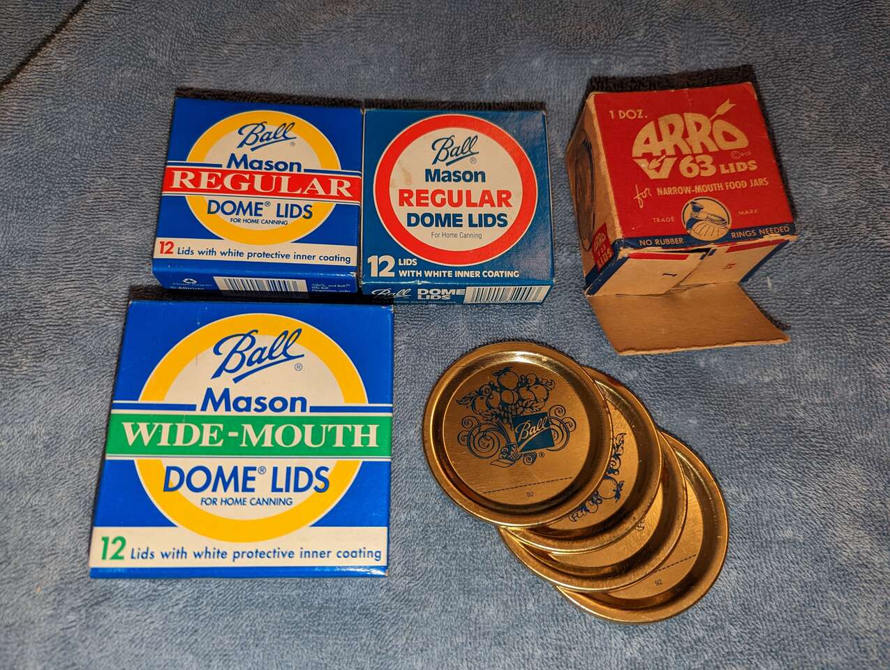 Vintage Mason Canning Lids Zinc & Milk Glass Atlas Qty 30 Plus More Ball Arro. Atlas zinc and milk glass mason canning lids - 30. Unmarked zinc and milk glass canning lids - 8. New Ball wide mouth canning lids new box of 12. New Ball regular mouth canning lids two box's of 12 plus four loose. New vintage Arro regular mouth canning lids box of 8.