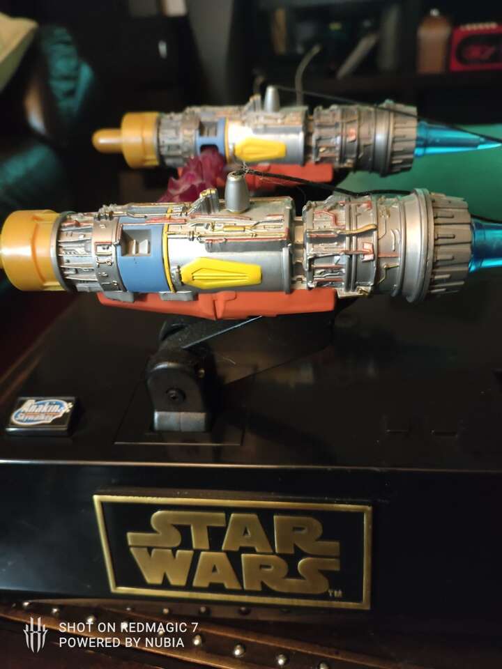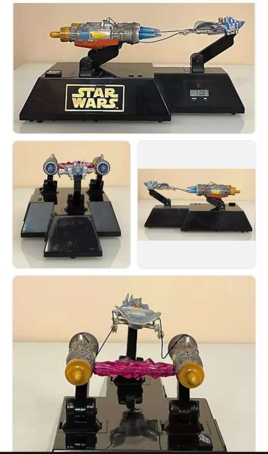 1999 think away toy STAR WARS Anakin Skywalker INTERACTIVE Pod Racer Alarm Clock Sounds/Moves. Movement/sound/clock works, lights not working. Uses 9 AA batteries (included but maybe are low,still making sounds and moves a little). Please look at all pictures for more details about condition.