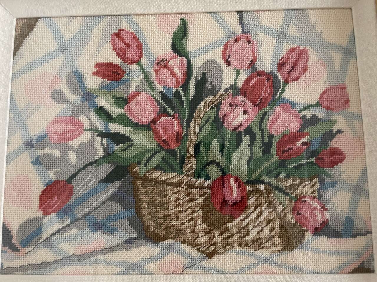 For sale is this very nice piece with a basket of Mauve and Red Flowers. The piece measures 15 1/2" tall x 20" wide and comes in a brown frame with glass in the frame. I think the piece is crewel but I'm not sure. If someone knows for sure text me and let me know. The piece is in excellent condition.