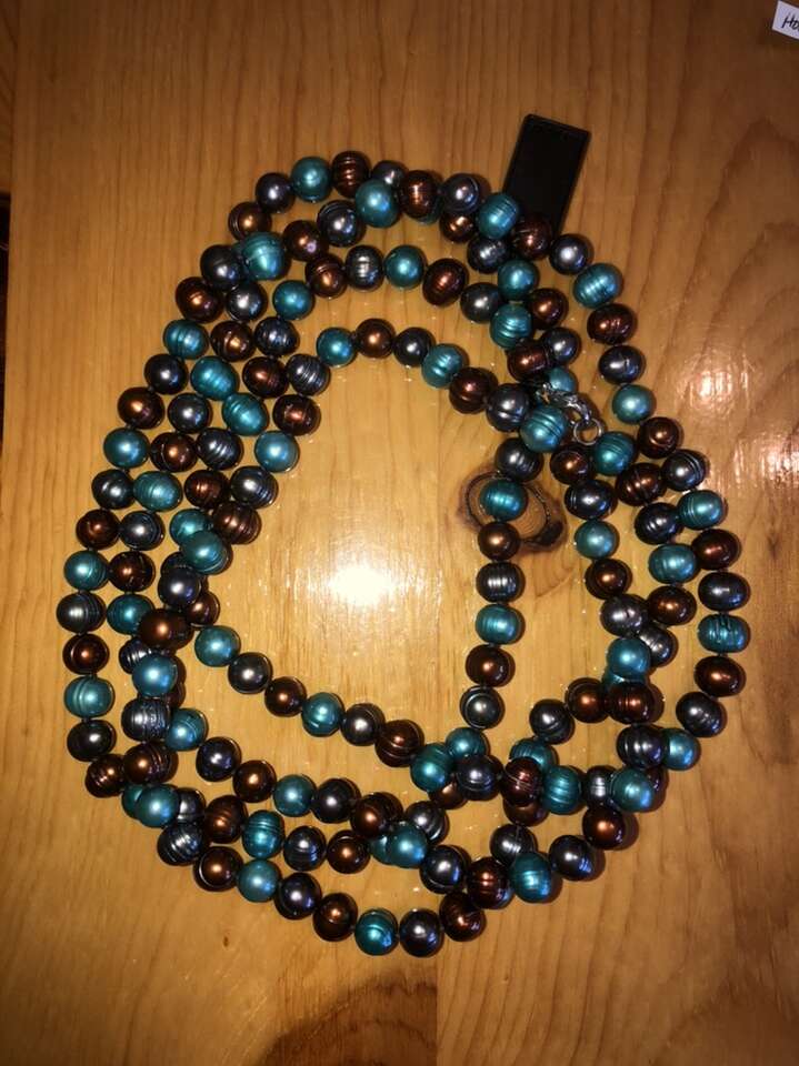 This is an amazing piece! 54” strand of individually knotted blue and brown multi-colored 9 mm freshwater pearls with sterling silver clasp. “Honora collection” New! Coordinating pearl earrings, rings and other Pearl jewelry also available!