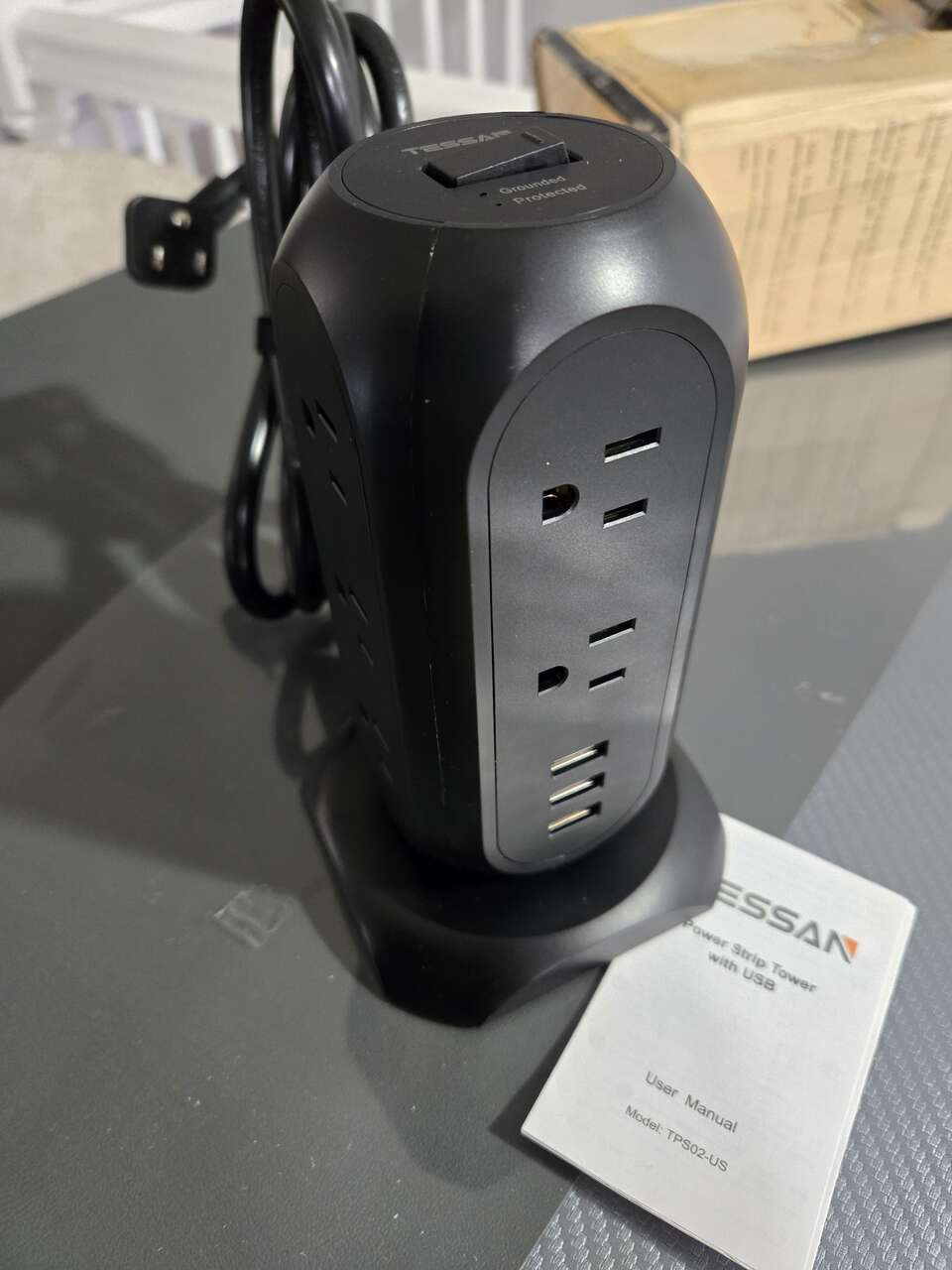 14 IN 1 Power Strip Tower: TESSAN surge protector power strip tower has 11 outlets, and 3 USB ports. The multi-outlet plug tower supports a wide voltage of 100V-250V, with 15A heavy-duty 6ft extension cord rated 1875W. And 3 USB Ports total is 5V/ 3A. (5V/ 2.4A Max Per Port) This 14 in 1 power strip can be your charging station for multiple devices.