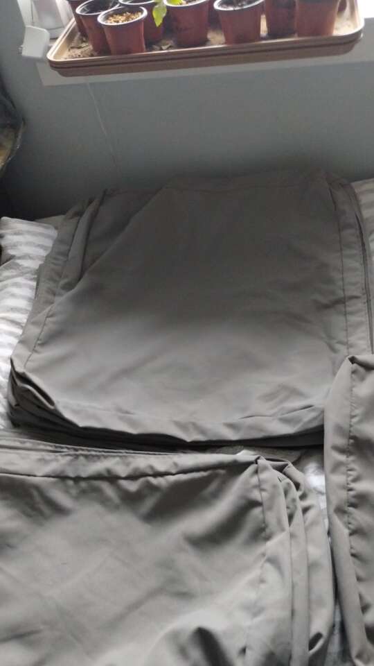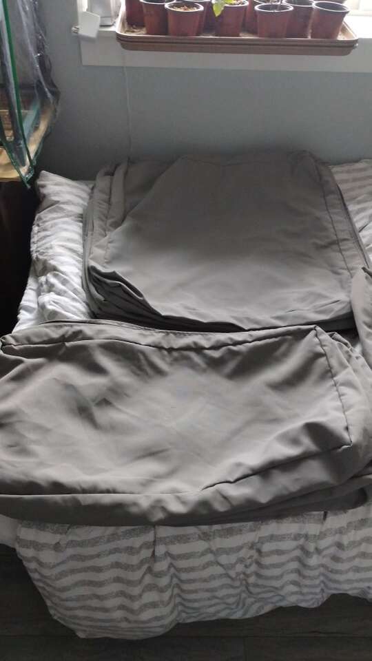 27x27x4 -7 of these 28.5 x14x 4 - 9 of these 22x 14x4 - 1 of these 32x32x4 -2 of these dark grey. be mindful I used my measurements so there might be a discrepancy as far as 1/4 to 1/2 of an inch or so. did my best to measure. didn't use all of these. also don't know the exact dimensions from package.... these were estimates. just like normal cushion covers, sometimes you can fit bigger in smaller ones... or if the measurements are slightly off of what you need.... it just might be what you need. . mostly just been in storage indoors. so dusty. but will clean so easily. high quality. also I got these brand new from another KSL person. so they are for the bigger cushions. but they are sturdy and are very good quality. not for the cheaper patio sets or cushions.