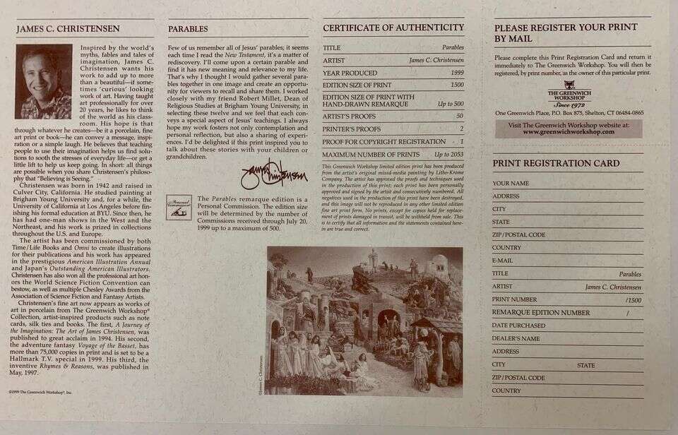 VenmoParables by James Christensen. Print, numbered and signed by the artist. Brand new and in perfect condition. See pictures for Certificate of Authenticity as well as other details. Let me know if you have any questions!