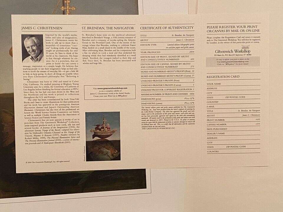 VenmoSt. Brendan The Navigator by James Christensen. Print, numbered, and signed by the artist. Brand new and in perfect condition. See pictures for Certificate of Authenticity as well as other details. Let me know if you have any questions!