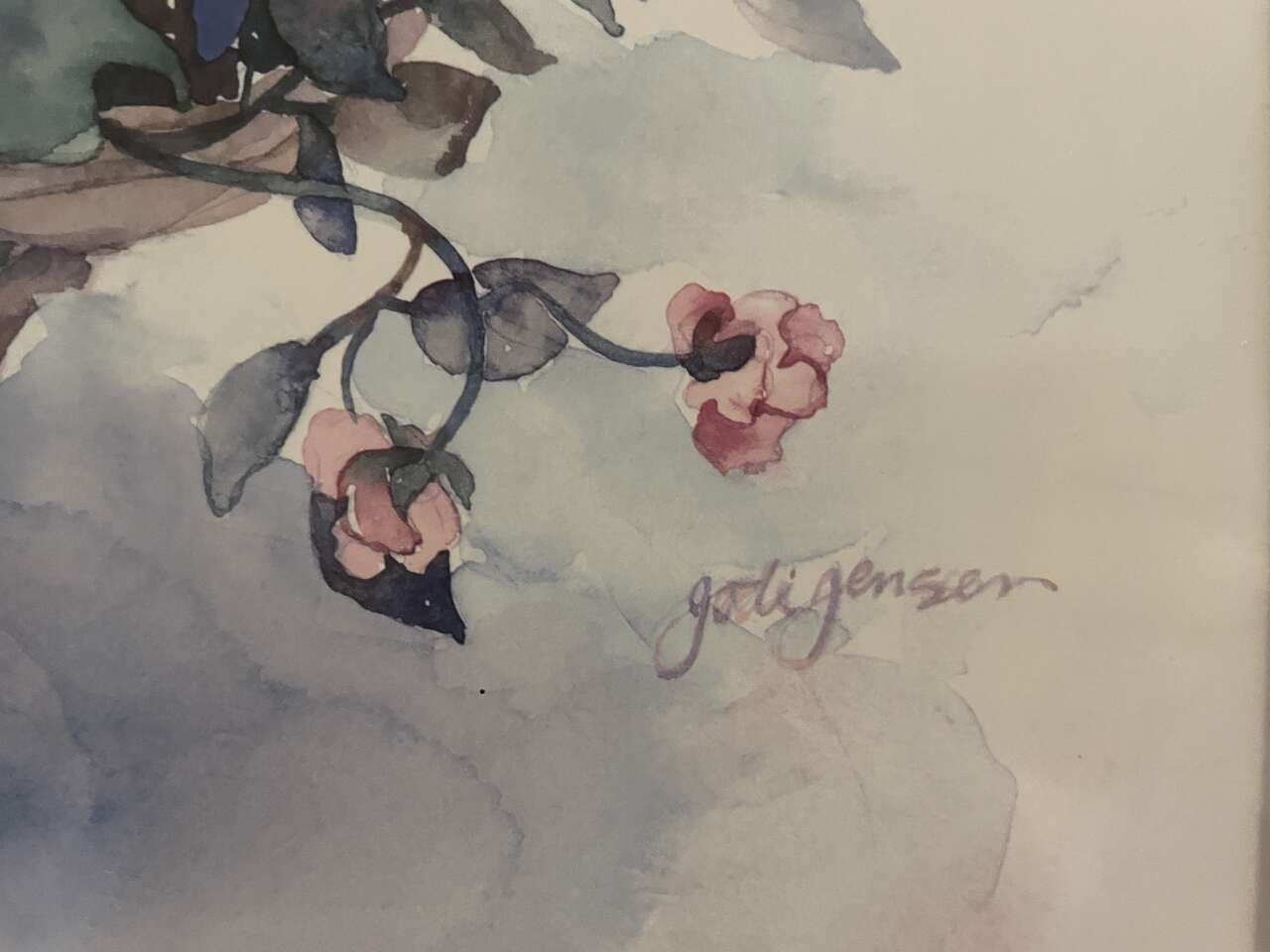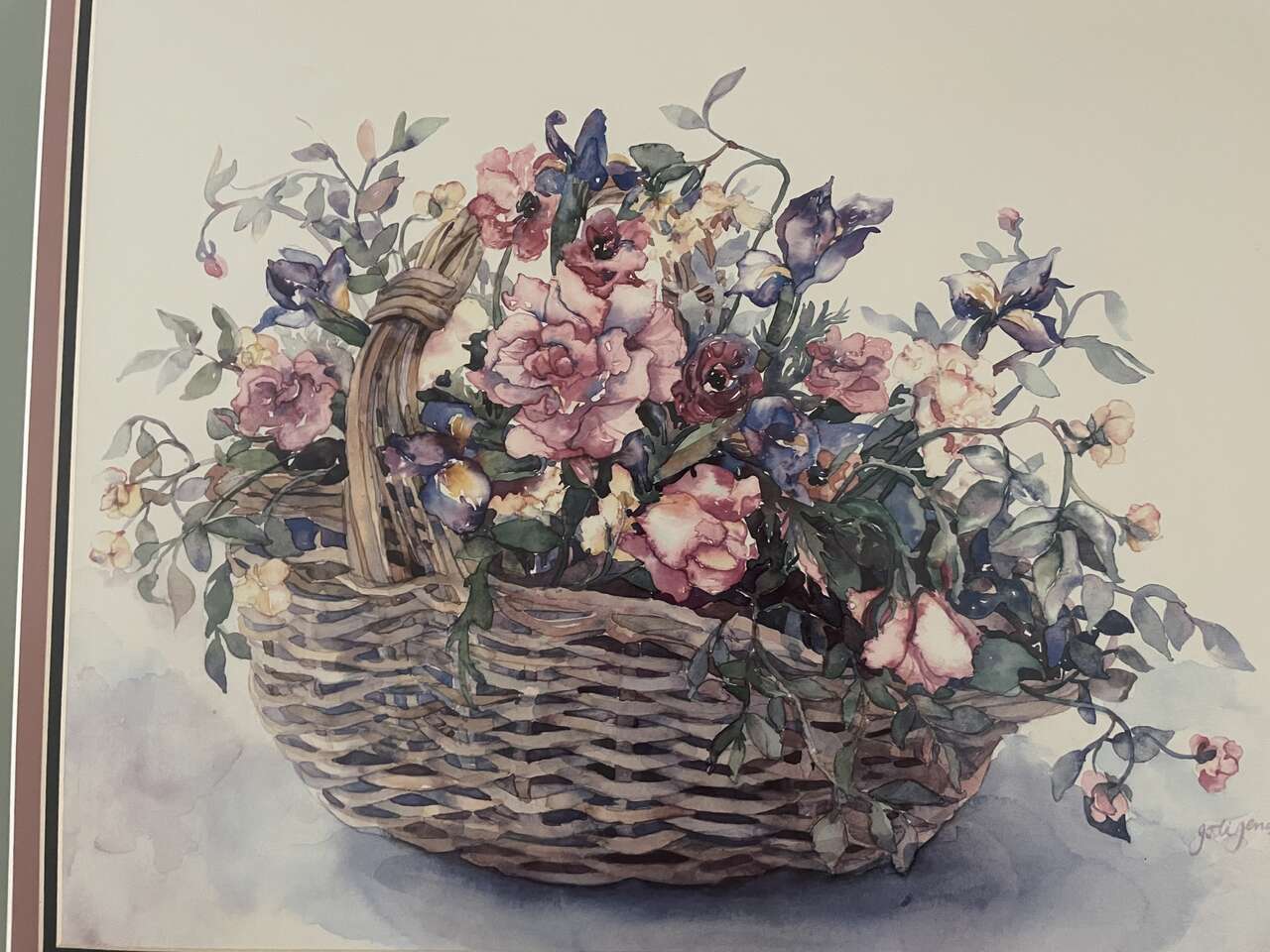 Picture of Brown Basket Full of An Assortment of Flowers. The picture measures 22" tall x 26" wide and is matted in a mauve and green mat and is in a gray frame with glass in the frame. The picture is signed by Jodi Jensen and is In excellent condition.