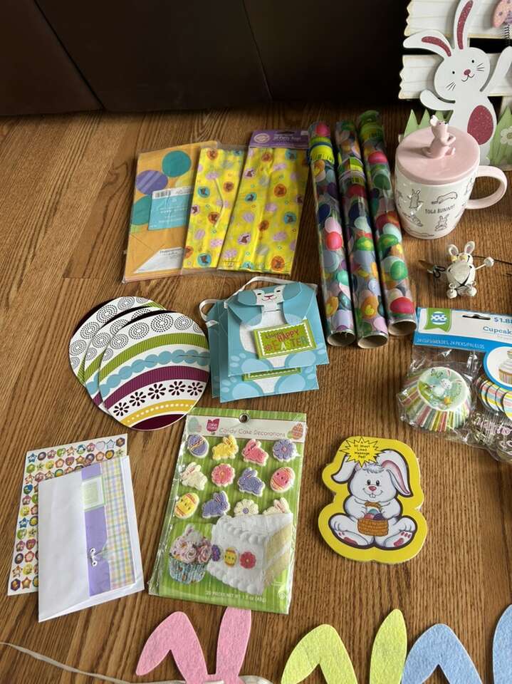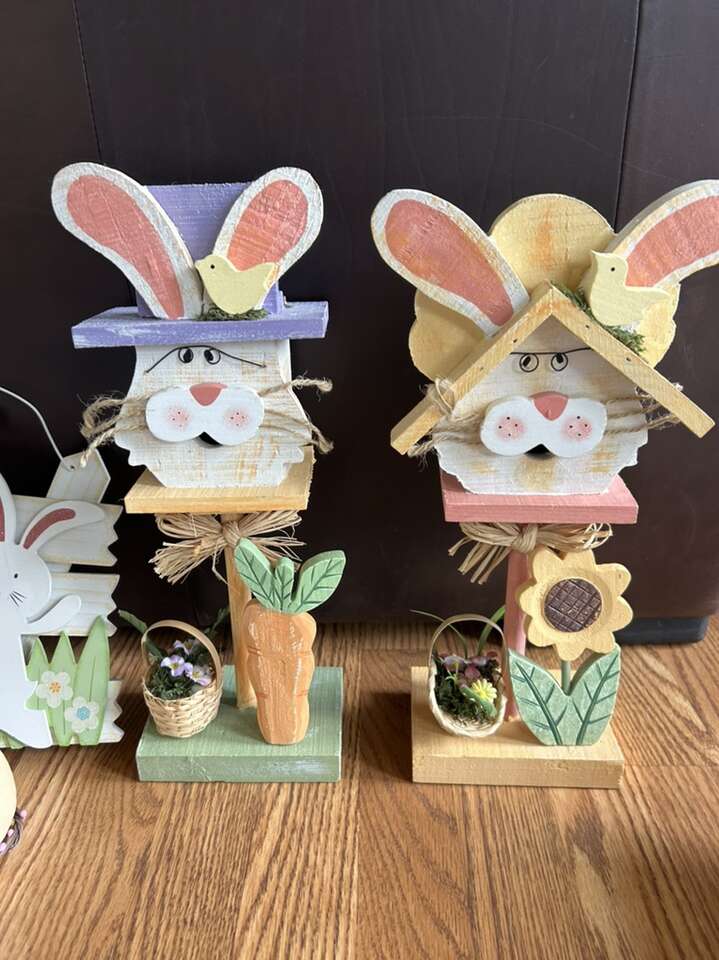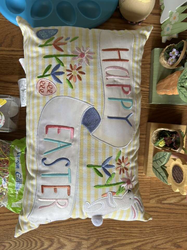 VenmoWide assortment of Easter decor. New and like new condition. All comes from a clean smoke free home. Everything pictured for one low price and one stop. Includes everything you see in the pictures. Two large wood girl and boy bunny statues. One embroidered striped spring pillow. White picket fence with three bunnies wall hanging or door wreath. Easter earrings. Easter grass. Easter themed cellophane bags, and cellophane wrap. Two Easter egg trays. Colorful, cottontail, bunny garland. Cash or Venmo. Porch pick up from Alpine.