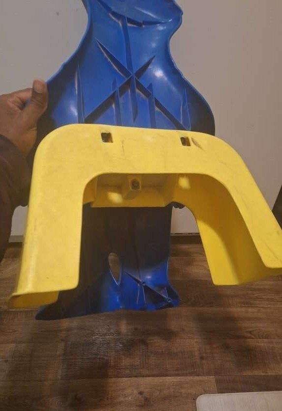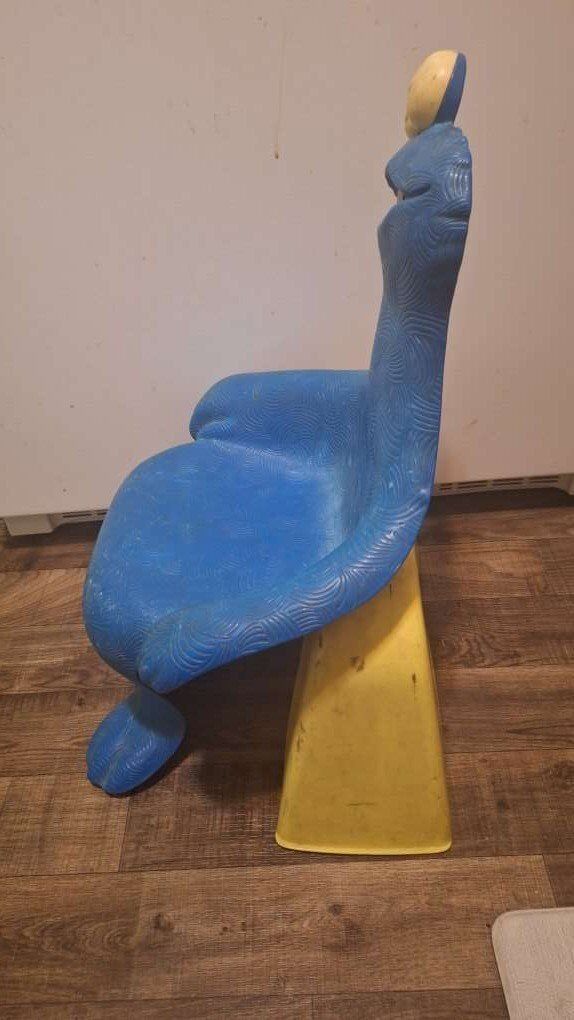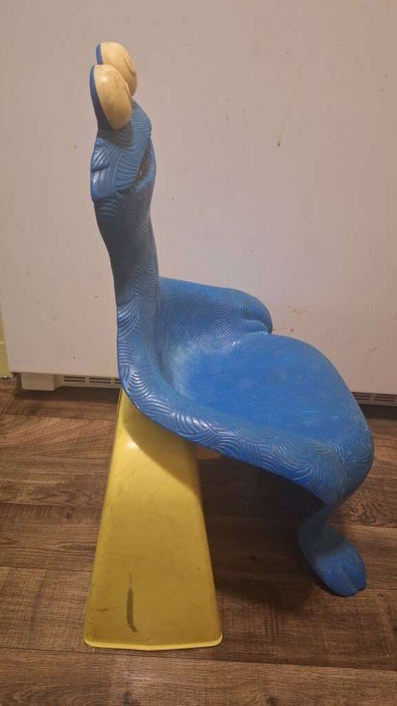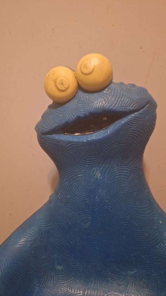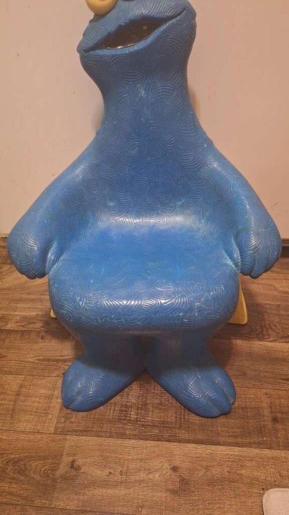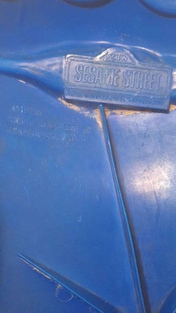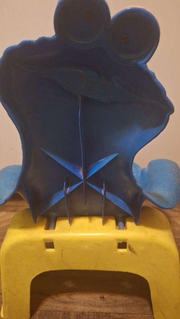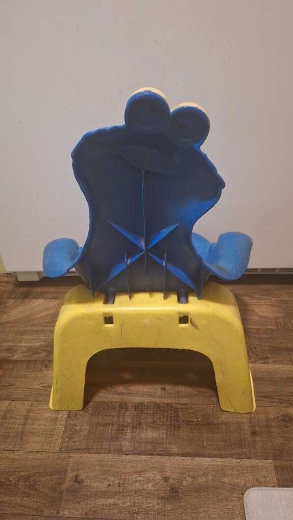 Here's a pre-owned, 1979 - Knickerbocker - Sesame Street - Cookie Monster toddler chair. The chair is pre-owned. The chair does have some wear to it. The eyes of Cookie Monster are missing his pupils. Also, one of the eye's of Cookie Monster has a crack on them. Also, there's some discoloration on the chair for wear, and the stand of the chair is loose.