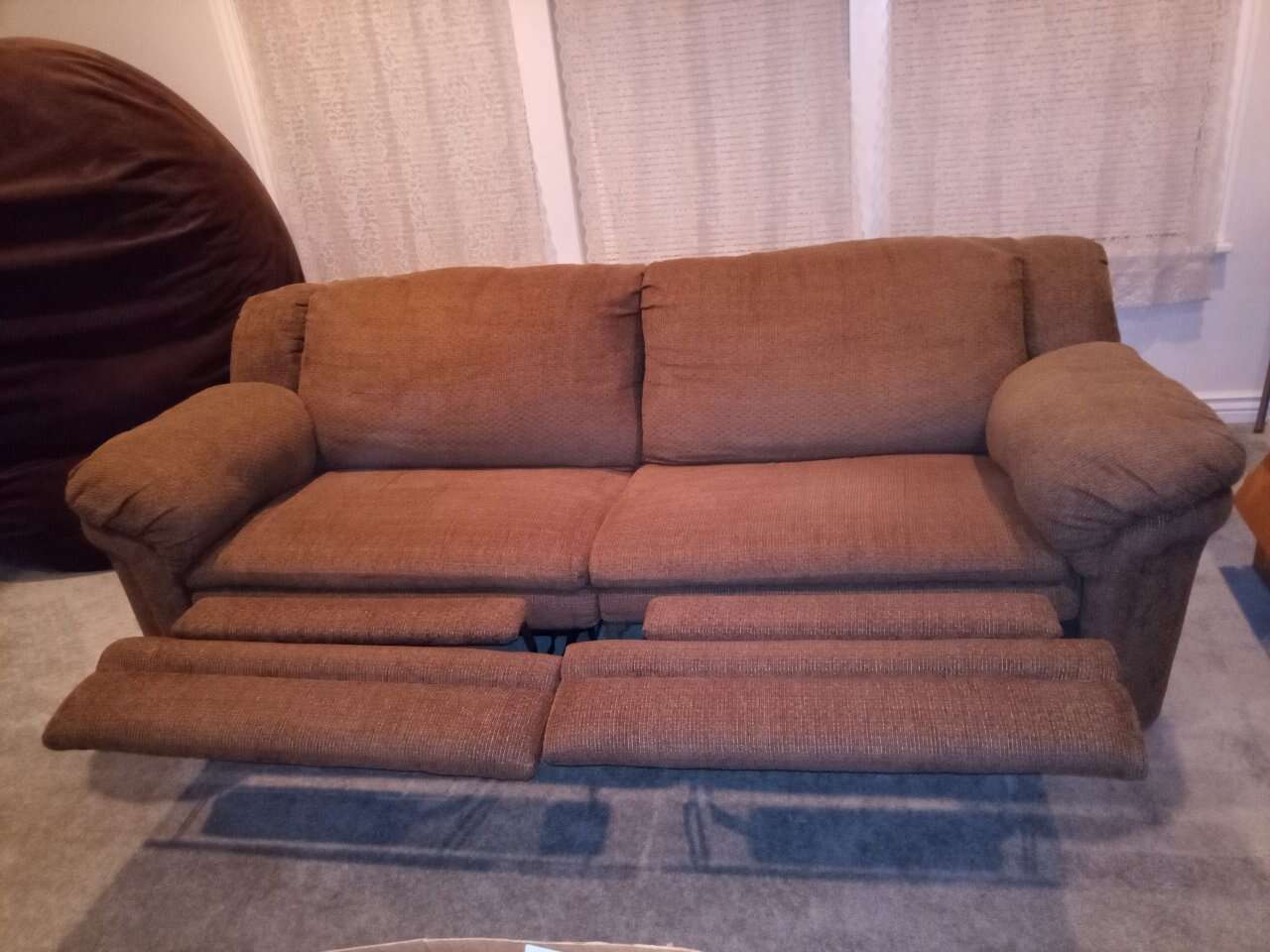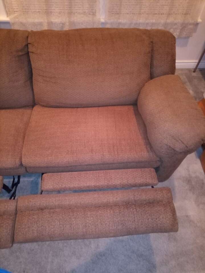 Price Reduced Again This fabric couch has dual recliners. It is in very good condition. From a smoke-free home. It has been in storage, unused, for several years. It had very little use prior. It was originally coated with Scotchgard. There are no known issues. No rips, stains, tears, holes, etc. Both recliners work as they should. It is very comfortable, and quite wide/long. The approximate dimensions are, total length approximately: 7' 6" Length inside of padded arms: 5' 6" Depth with recliners closed: 3' 6" Height to top of couch back from floor: 2' 9" Please see pictures for color. I would say the most accurate picture would be just the fabric swatch. The other pictures don't do it justice. I would call it a brown/green, with a slight multicolor built-in. It is a short ribbed soft fabric. Pillows shown included, if interested. It will take at least two strong individuals to move it out of the house. It's on the main level, near the front door currently. There are only two steps off the porch. Cash or Venmo only.