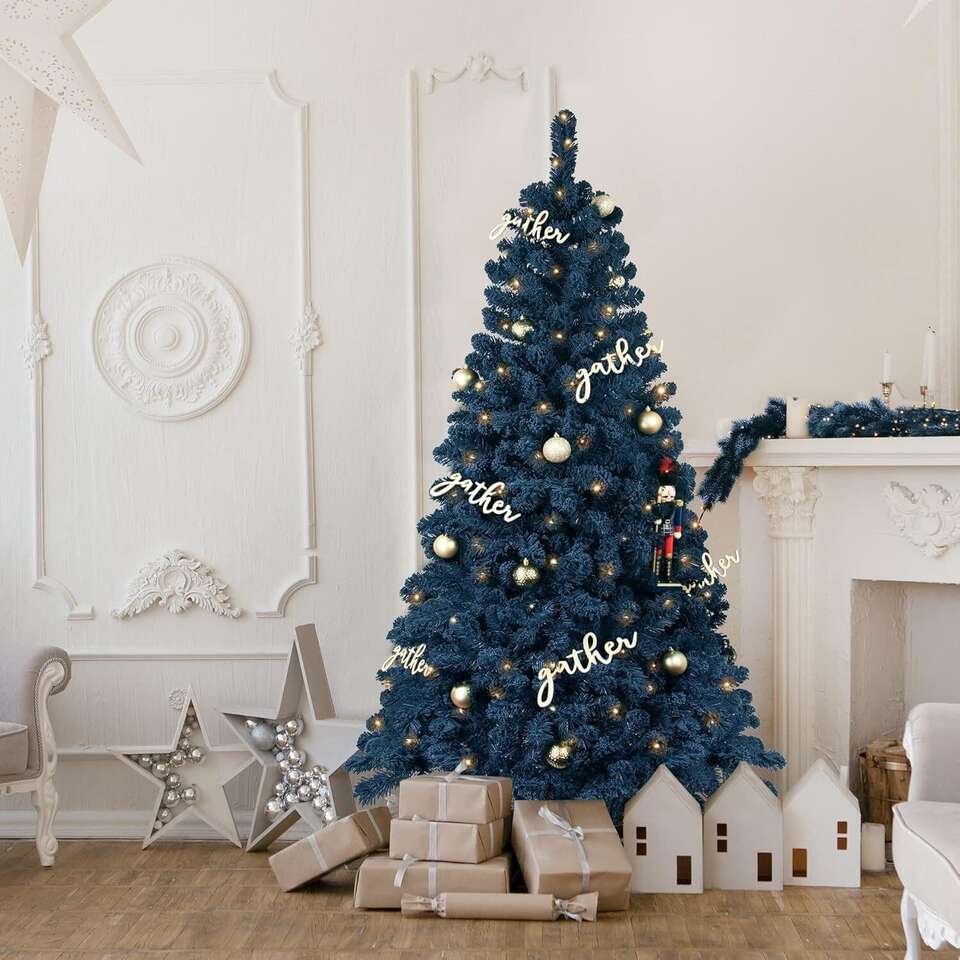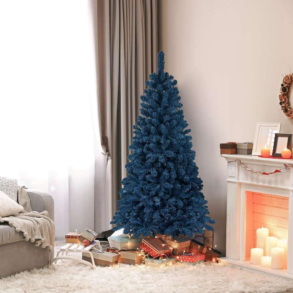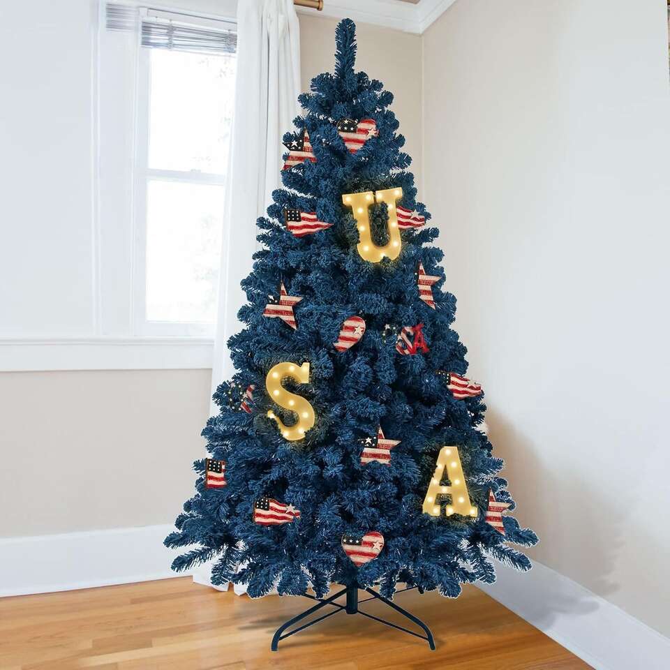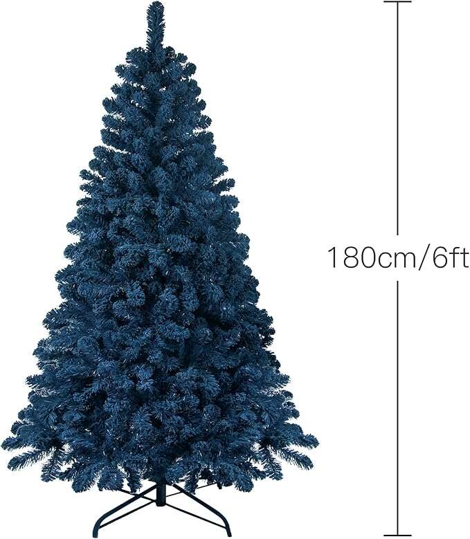 KI Store 6ft flocked blue Christmas tree is a eye catching and beautiful holiday centerpiece with or without tree ornaments. Blue Christmas tree with the flocking of Blue snowfall. The shade of blue is more like dark blue or navy blue. Add a festive flair to your holiday decor with this brightly colored Christmas tree. Hinged Christmas Fir Tree with metal tree stand. Convenient hinged branches for simple setup and fluff. A pair of groves for setup included. Versatile Home Decorations. Ideal as patriotic tree for Memorial Day, Independence Day, Veterans Day, and any other occasions. Full artificial blue Christmas tree measures 6ft tall and 40 inches in diameter. For indoor and dry outdoor use. #128 2-25-25 05.01