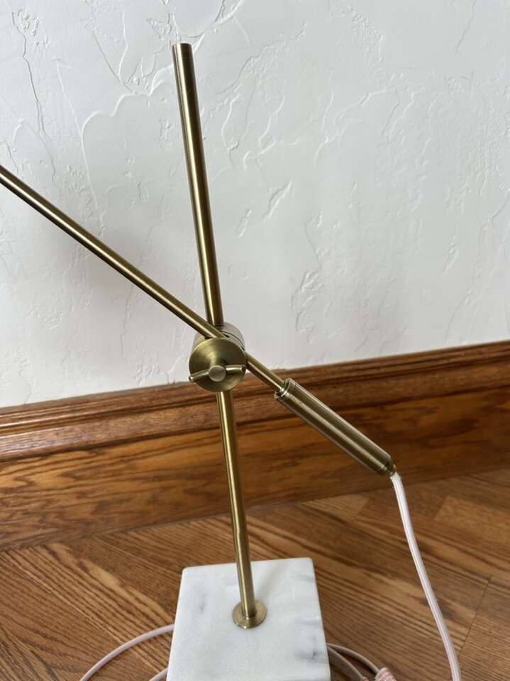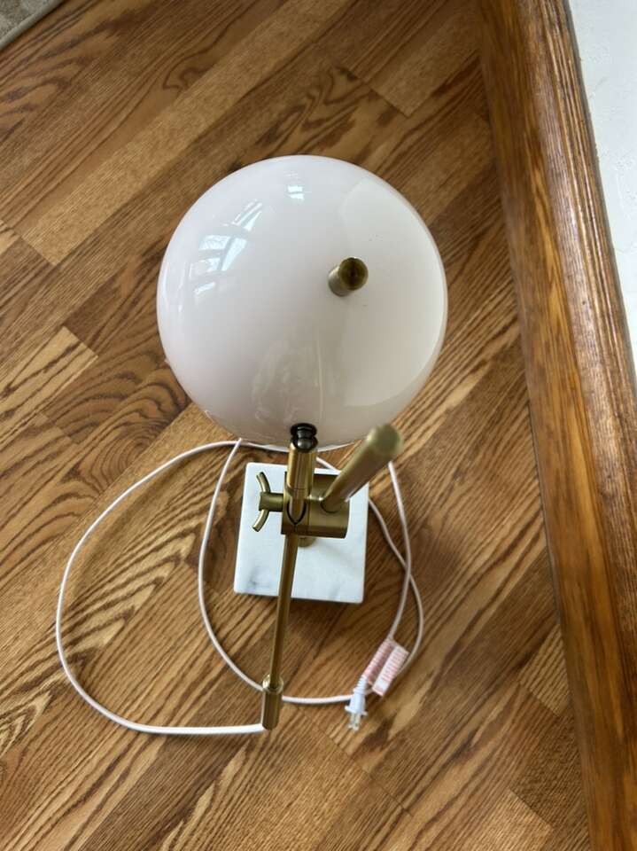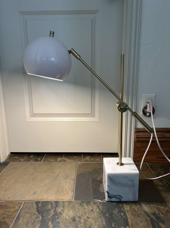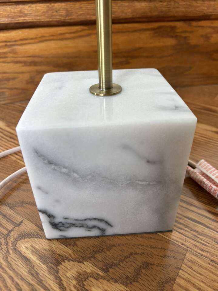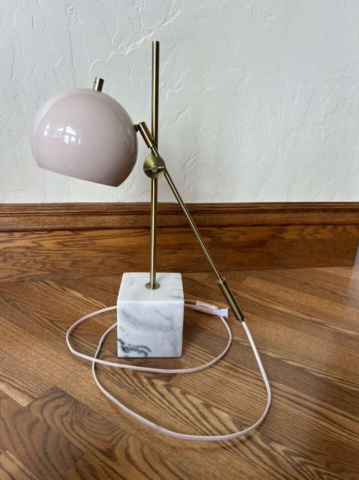 VenmoIn excellent condition round dome shaped blush pink lamp shade with brass swivel switch clicks on and off on a thin adjustable brass rod. Can be adjusted to almost any height and angle with a simple twist. Beautiful cube shaped white and gray marble base. This is heavy. Extra long cord is wrapped in blush pink mesh for extra sophistication. Clean smoke free home. Cash or Venmo. Porch pickup from Alpine.